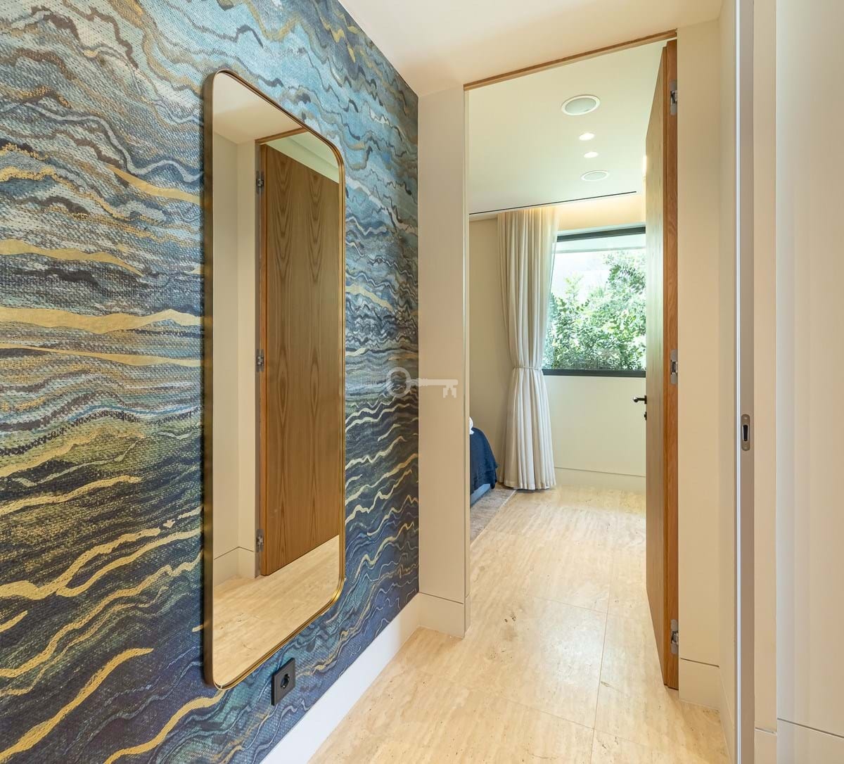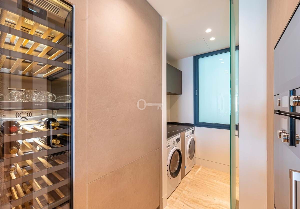 Spanning an impressive 120m² of interior space, the apartment features two generously proportioned bedrooms and two meticulously designed bathrooms. The fully fitted kitchen, equipped with high-end appliances, flows seamlessly into the open-plan dining and living areas, creating a perfect space for entertaining or relaxation. Premium finishes, including marble flooring, double glazing, and glass doors, enhance the sophisticated aesthetic, while the home automation system, central heating, and air conditioning ensure year-round comfort. Additional highlights include a utility room, storage room, and 2 private garage spaces