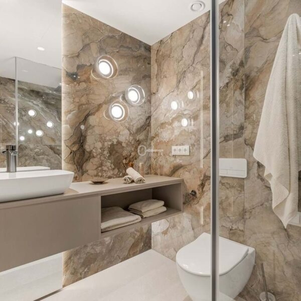 Every room has been thoughtfully furnished by our interior designer, showcasing luxurious details like custom wardrobes, walk-in showers, a freestanding bathtub, a Bang & Olufsen sound system, and a sleek modern fireplace. The expansive rooftop terrace offers breathtaking, unobstructed views of the Mediterranean and includes dedicated dining, wellness, and relaxation areas.