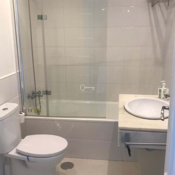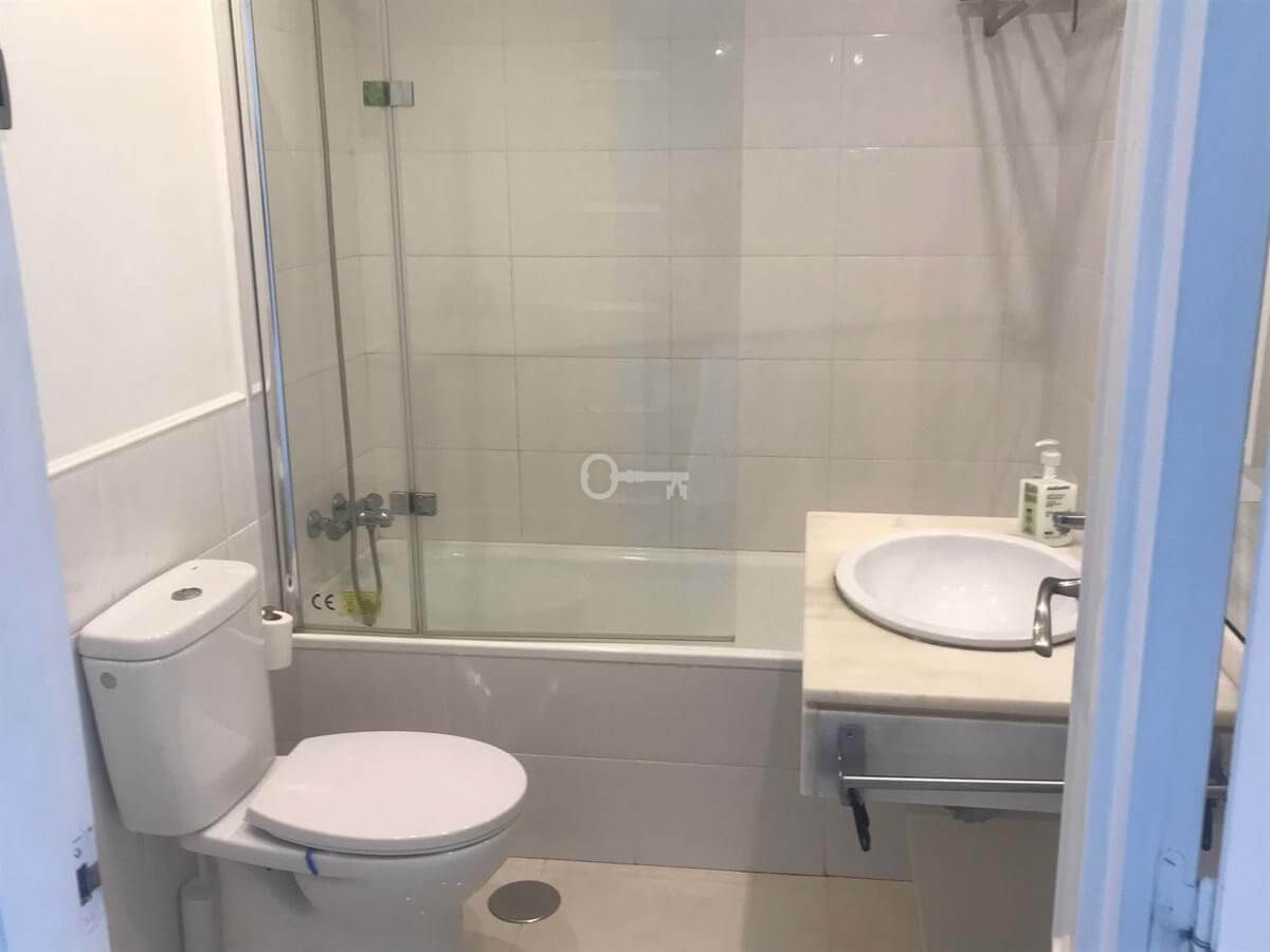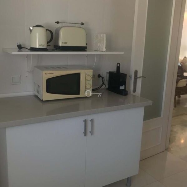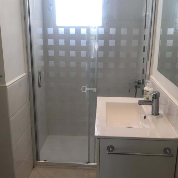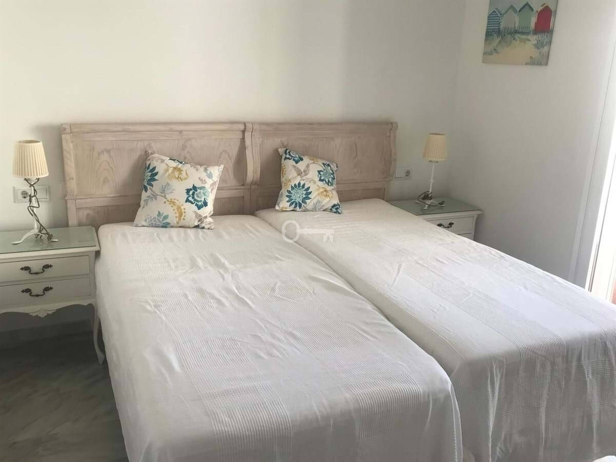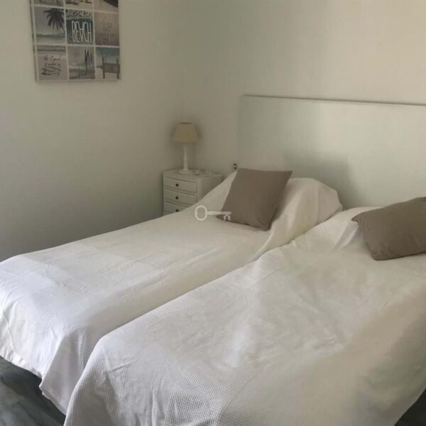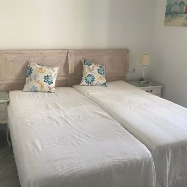 The property features two spacious double bedrooms, both with fitted wardrobes, and two full bathrooms, one fitted with a bath and the other with a shower. The kitchen and the bright living-dining room form a cosy open-plan space leading out to a lovely terrace on the same level, overlooking the residential complex.
