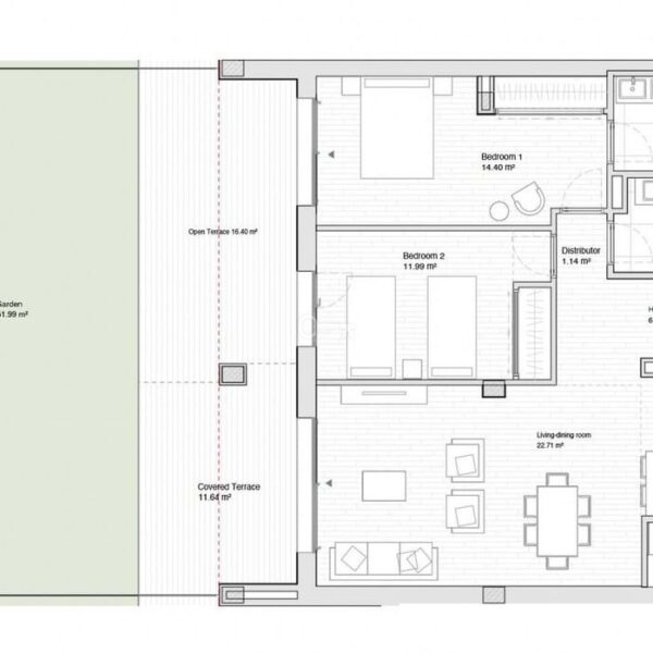 The apartment offers a well-designed contemporary layout with a bright open-plan living and dining area connected to the outdoor spaces. In addition to a generous 29m² of terraces, ideal for outdoor dining and relaxing, the property also benefits from a private 52m² garden, giving it the feel of a small house and making it particularly attractive for buyers looking for ground floor living with usable exterior space.