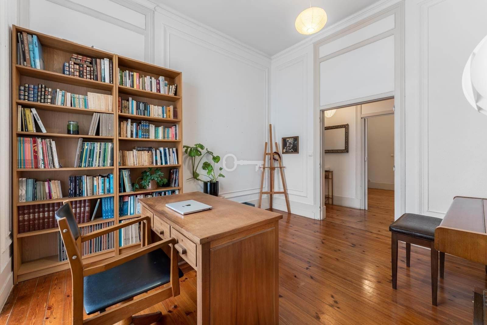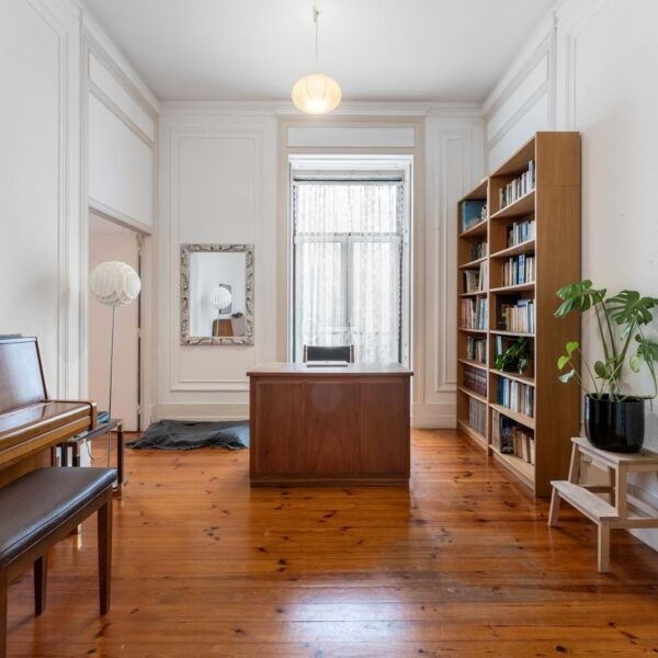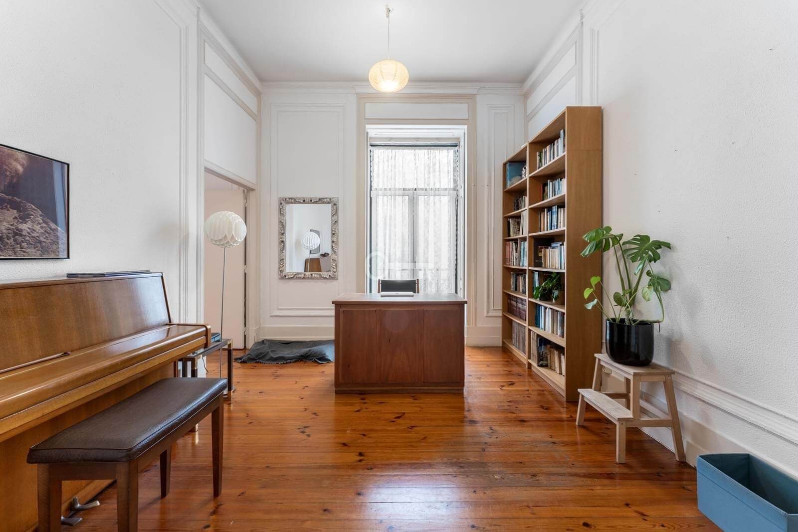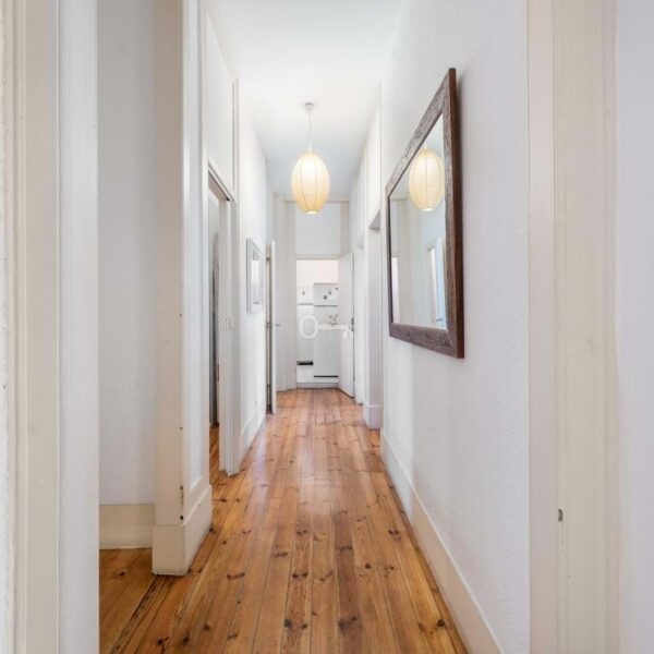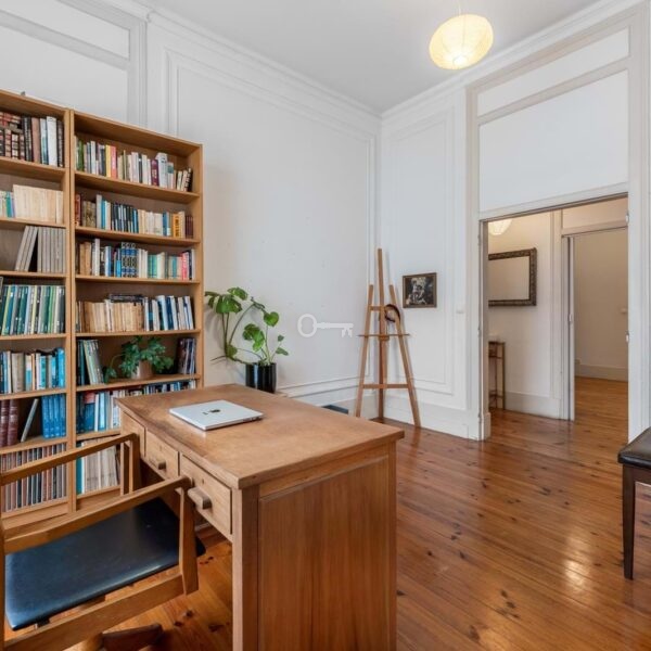 The interior stands out for its scale and light, with high ceilings, large windows and a layout that favours generous areas. The current configuration includes five bedrooms, two bathrooms, wide corridors and living spaces of a dimension rarely found in more recent constructions. An open, sun-filled marquise facing the inner courtyard offers an additional versatile area.