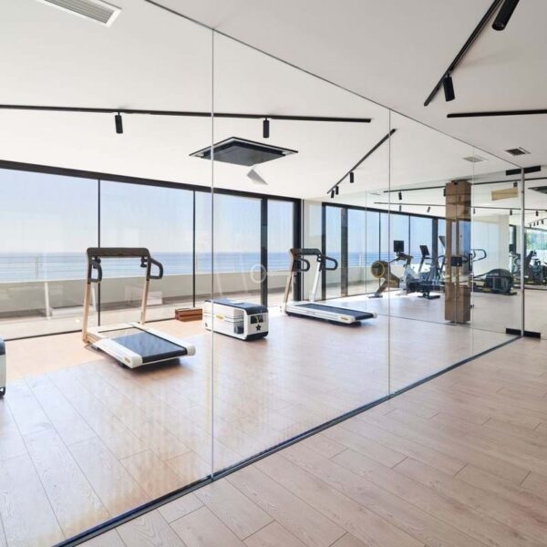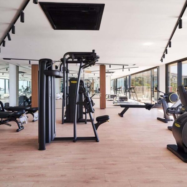 Gym with Technogym equipment and frontal sea views