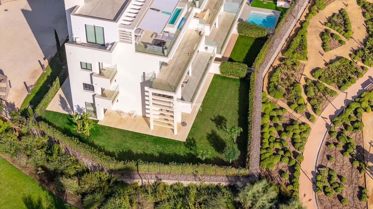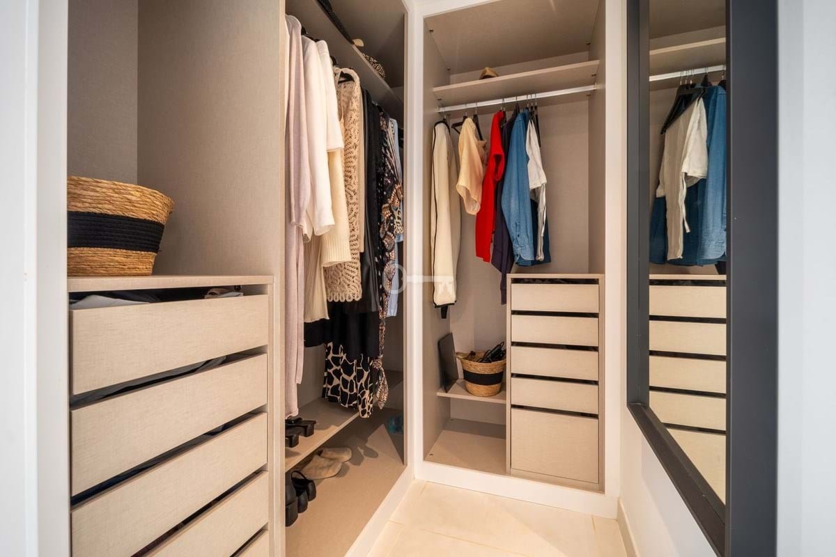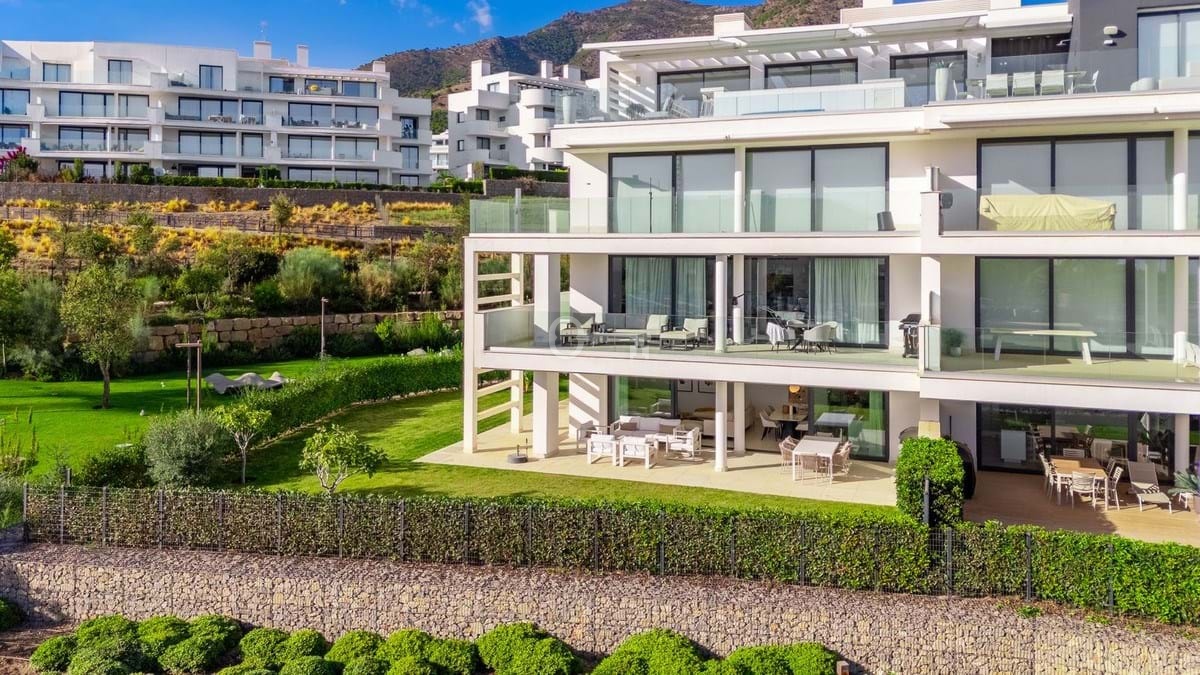 Stunning west facing corner garden apartment, with 3 bedrooms, and 2 bathrooms, spacious living-dining room, open plan kitchen fully furnished and equipped with electricial appliances from Bosch, including MIELE fridge/freezer, laundry area with washing machine/dryer, large wrap around terrace of 78m2 with access from living area and main bedroom. There is also a backside terrace of 34m2 with access from the secondary bedrooms. Spacious private garden area of 258m2. Main bedroom with ensuite bathroom and walk-in wardrobe. Air conditioning hot and cold, built-in wardrobes in secondary bedrooms and hall entrance, video intercom, domotic system, pre-installation alarm system, water purification system in kitchen, under floor heating throughout all the apartment including bathrooms. Includes two parking spaces (one parking with electric car charger) and one storage room.