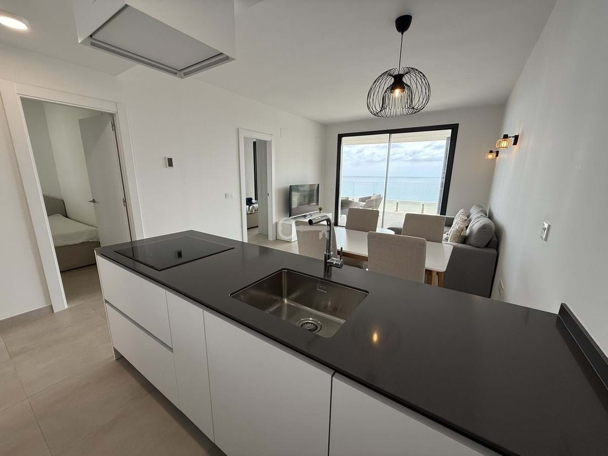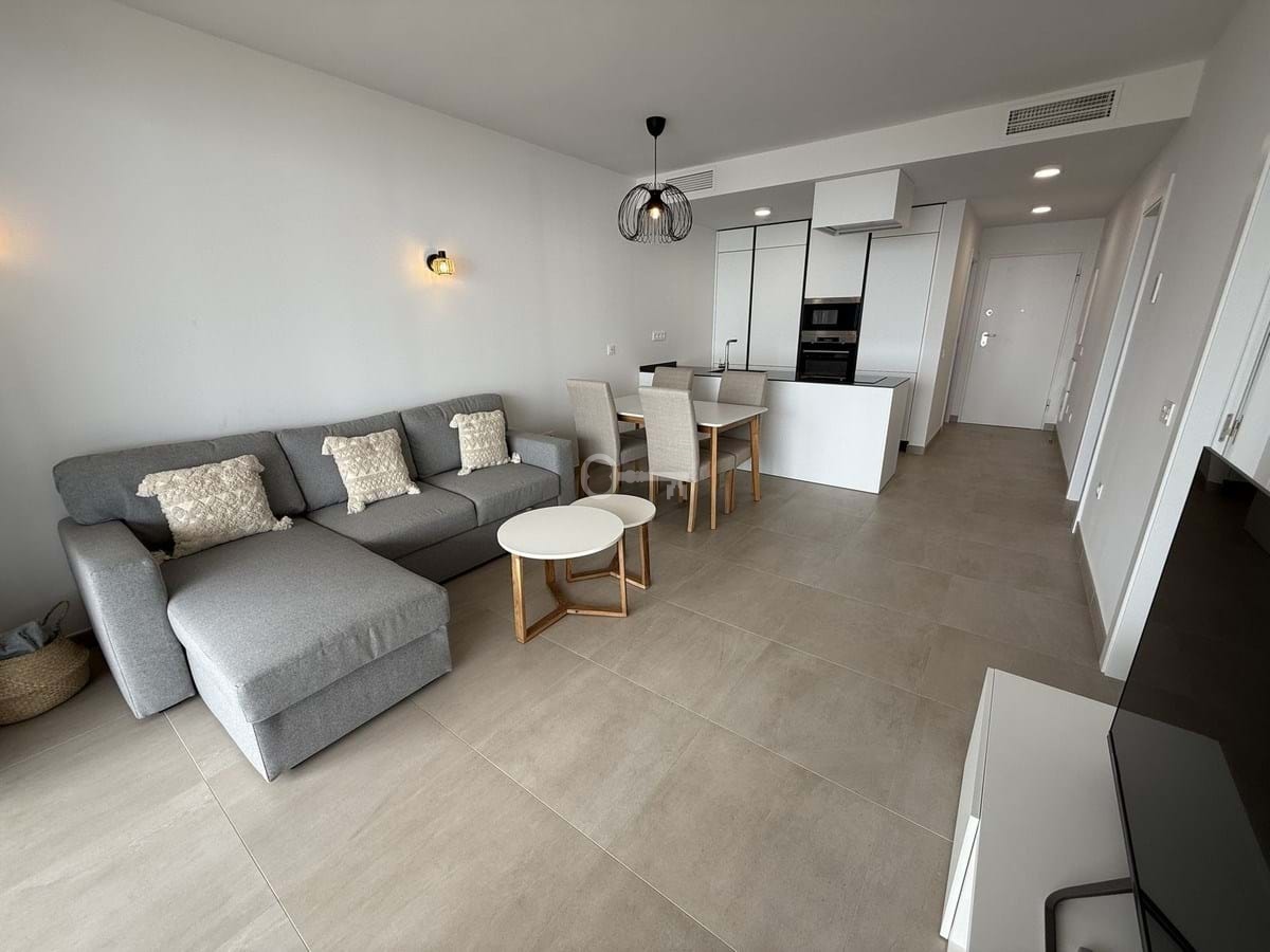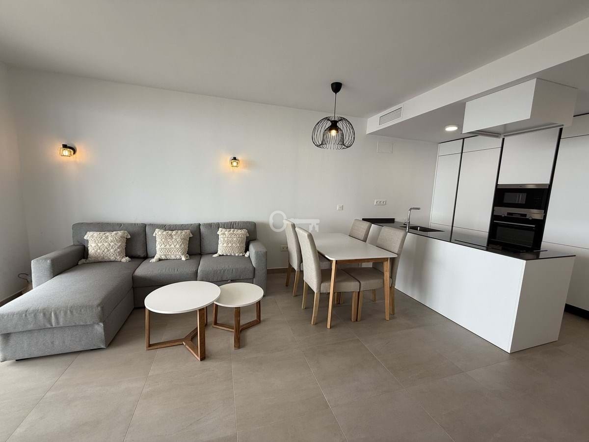 The apartment features a bright open-plan living and dining area with direct access to a spacious terrace showcasing panoramic views of the Mediterranean. The contemporary kitchen is fully equipped, and both bedrooms are generously sized, with the master suite offering an en-suite bathroom and built-in wardrobes. The finishes are of high quality throughout, making this a move-in-ready home.