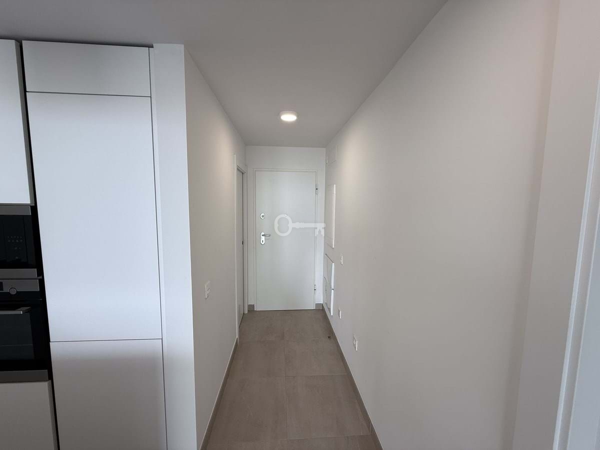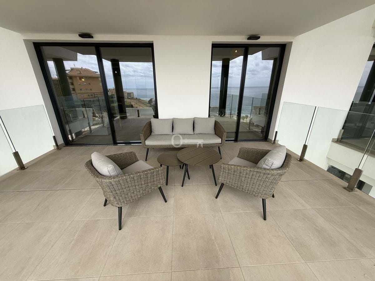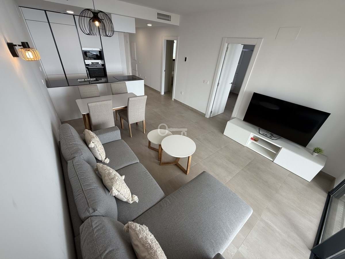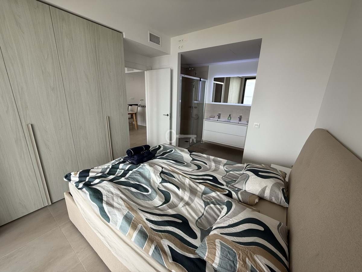 The apartment features a bright open-plan living and dining area with direct access to a spacious terrace showcasing panoramic views of the Mediterranean. The contemporary kitchen is fully equipped, and both bedrooms are generously sized, with the master suite offering an en-suite bathroom and built-in wardrobes. The finishes are of high quality throughout, making this a move-in-ready home.