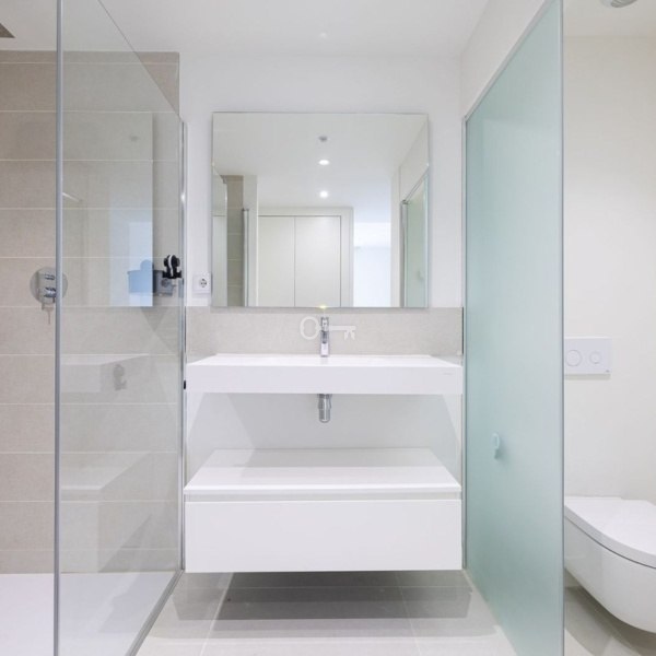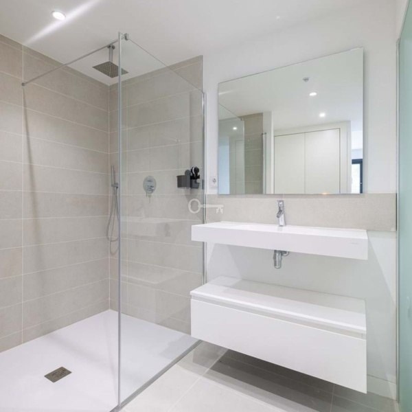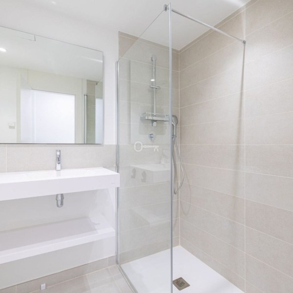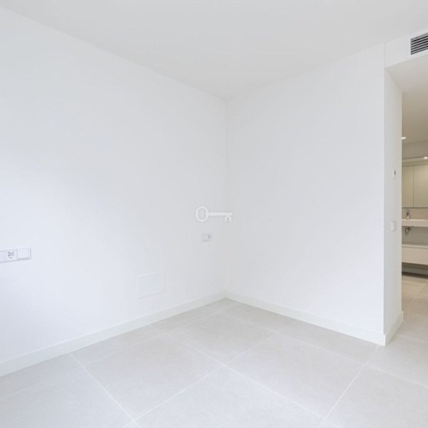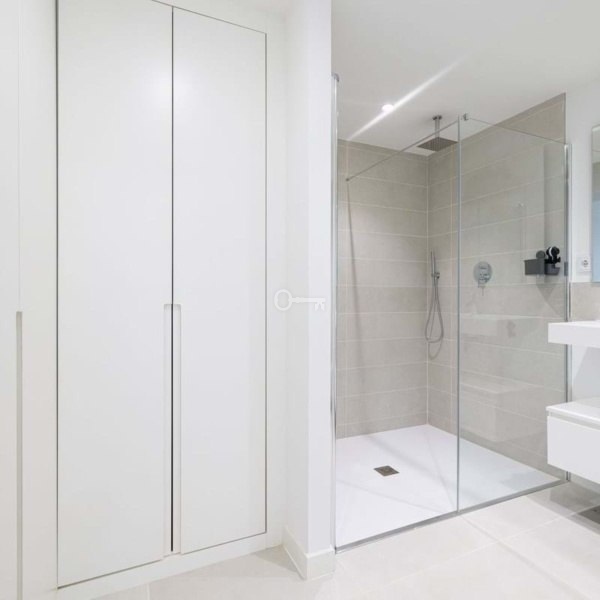 The apartment is equipped with all modern comforts, including underfloor heating and a smart home management system. The gorgeous open-plan kitchen features a large refrigerator, a kitchen island, and high-end Neff appliances. The property benefits from many extras provided by the developer, such as electric blinds, dimmable lighting, hidden TV cables, a built-in hob in the kitchen island, and a remote-controlled extractor fan. The underfloor heating, refrigerator with ice maker, microwave in addition to the standard oven, and wine fridge were all custom upgrades chosen by the current owner. There are two spacious double bedrooms, one of which has a large en-suite bathroom with stylish, motion-sensor LED lighting. Both bathrooms are modern and feature high-quality fixtures from Villeroy & Boch and Grohe. Adjacent to the kitchen, you’ll find a laundry room with a NEFF washer/dryer.