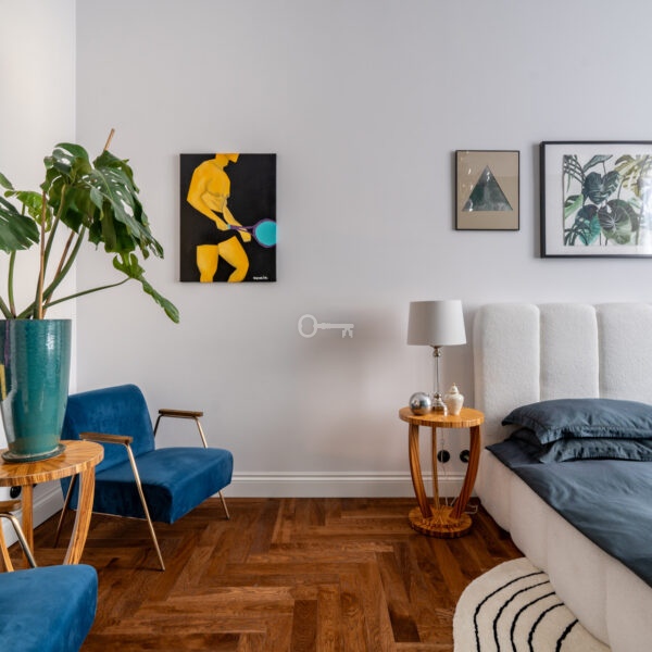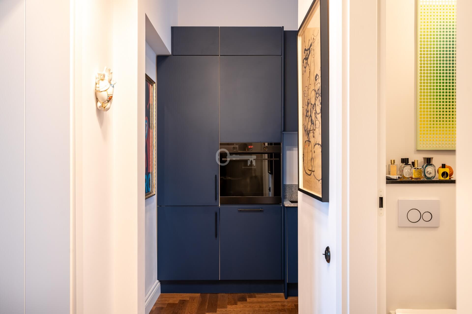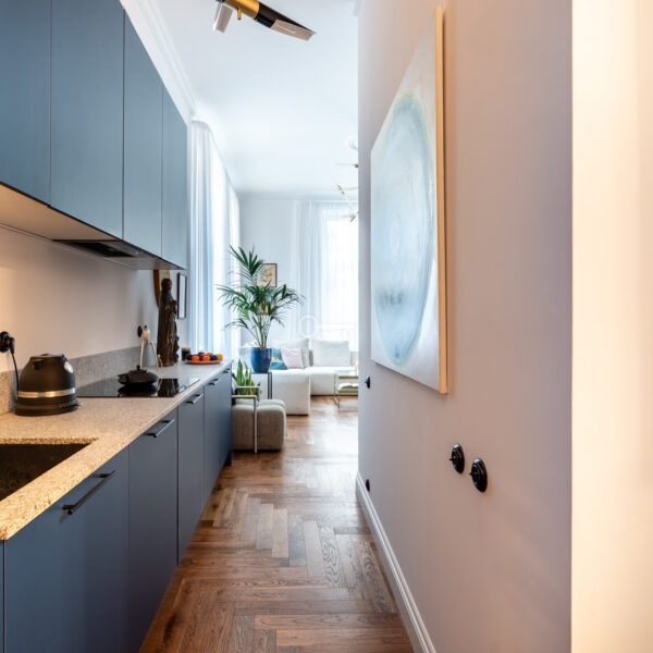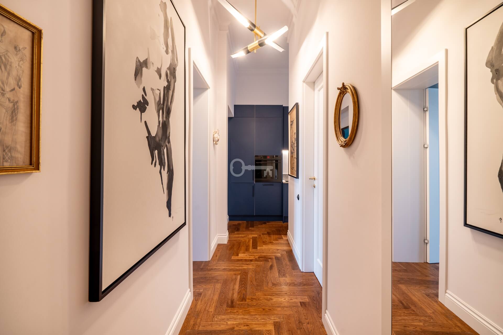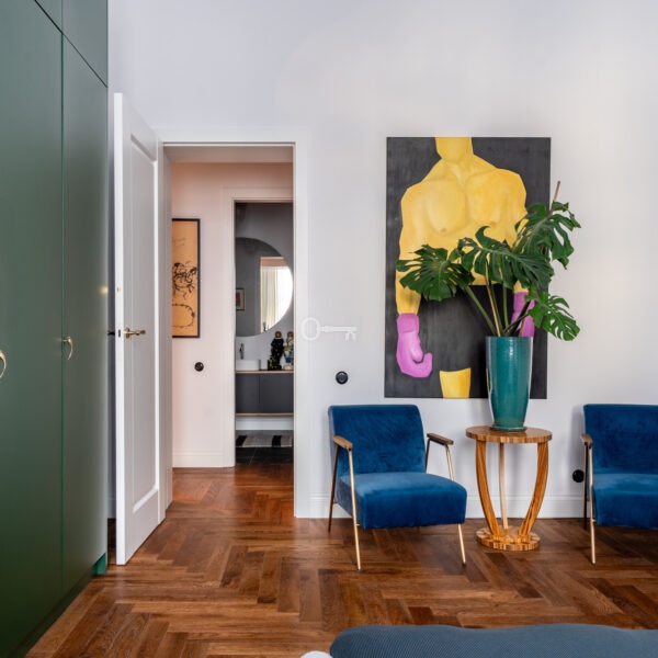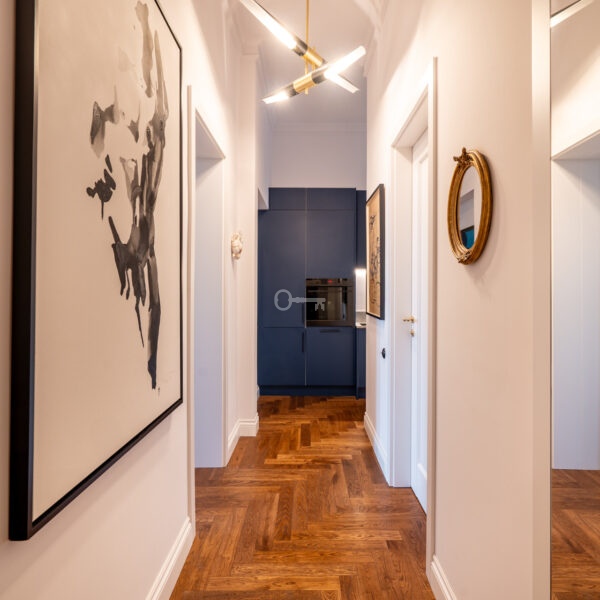 The room heights of 3.6 m, classic oak parquet flooring arranged in a herringbone pattern, and tall doors give the space a sense of nobility and timeless elegance. This apartment combines the building’s history with a modern, functional design.