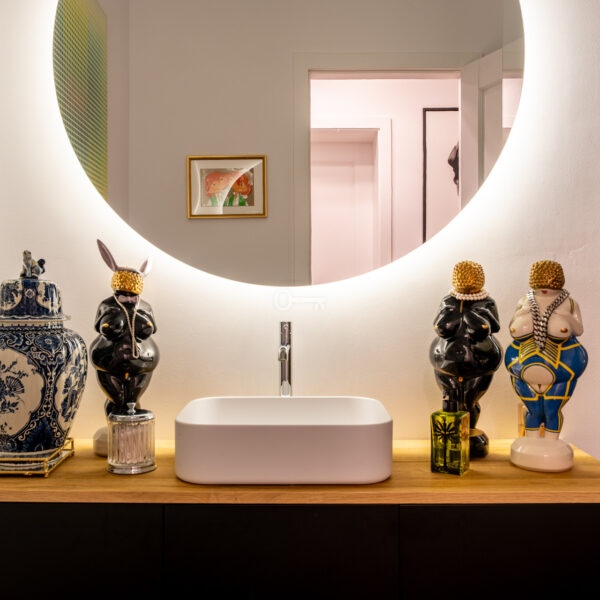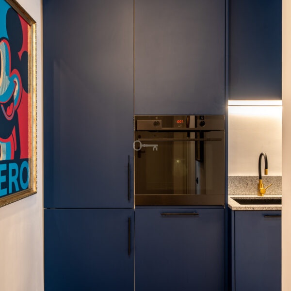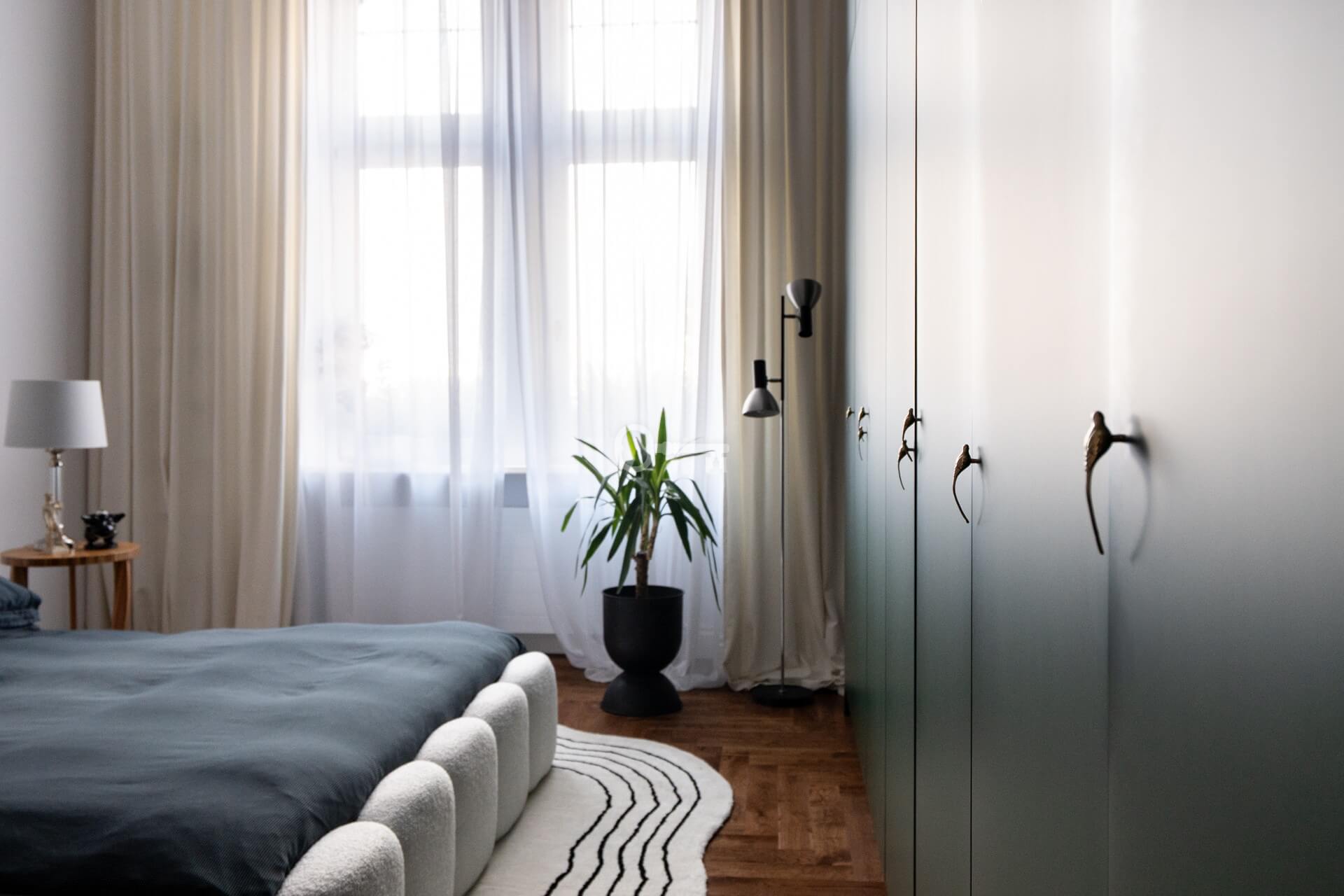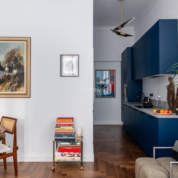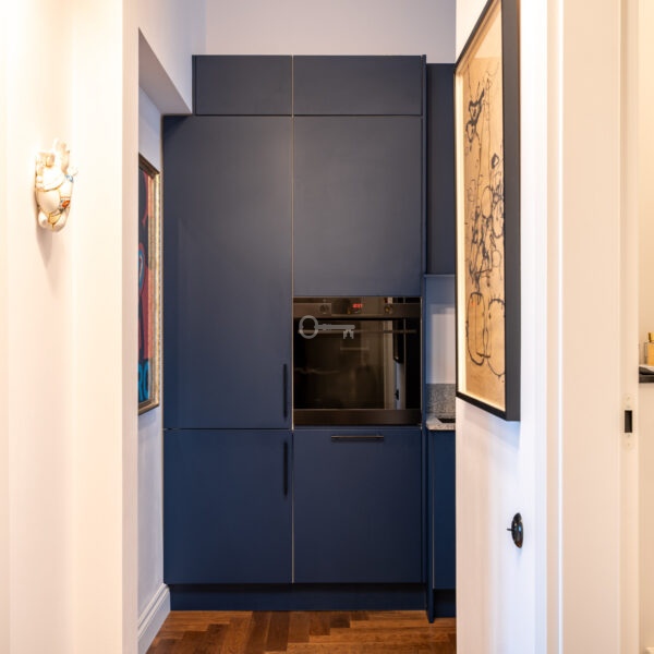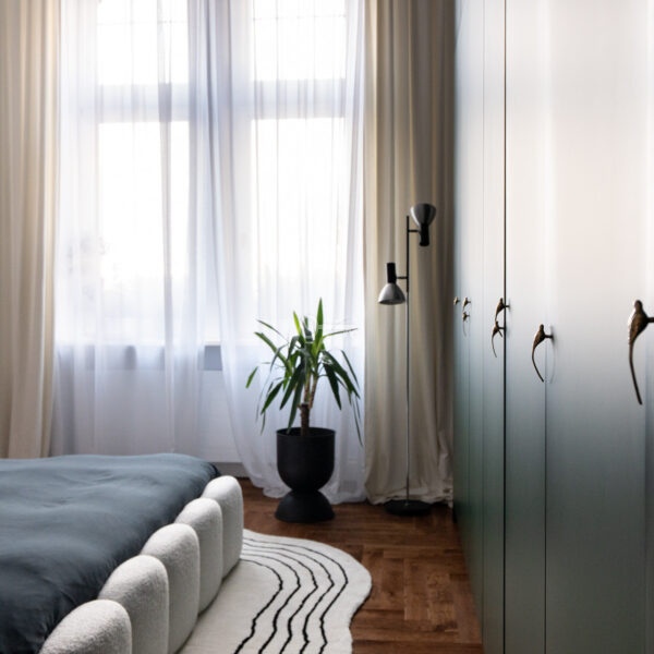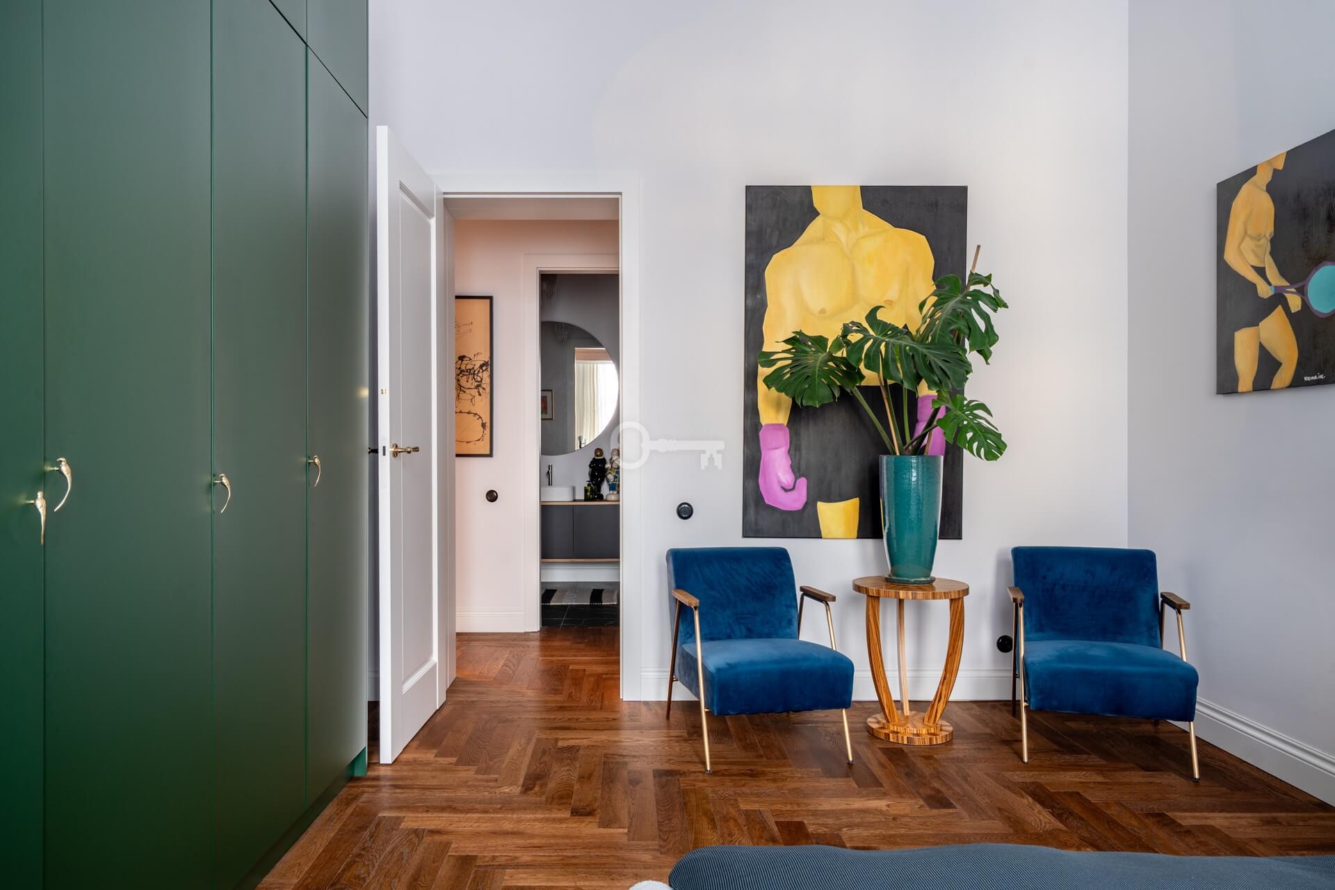 The room heights of 3.6 m, classic oak parquet flooring arranged in a herringbone pattern, and tall doors give the space a sense of nobility and timeless elegance. This apartment combines the building’s history with a modern, functional design.