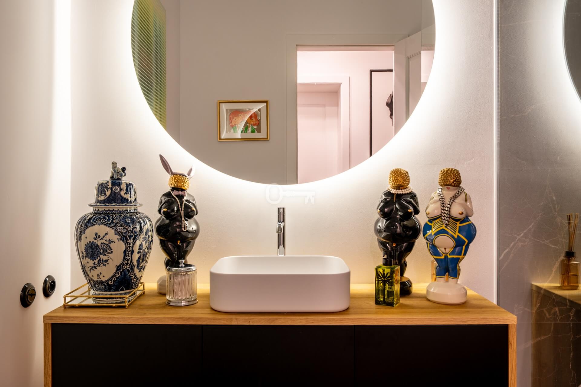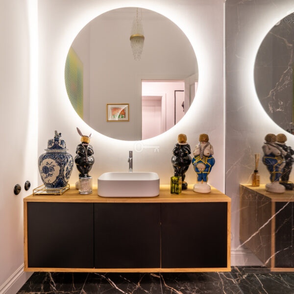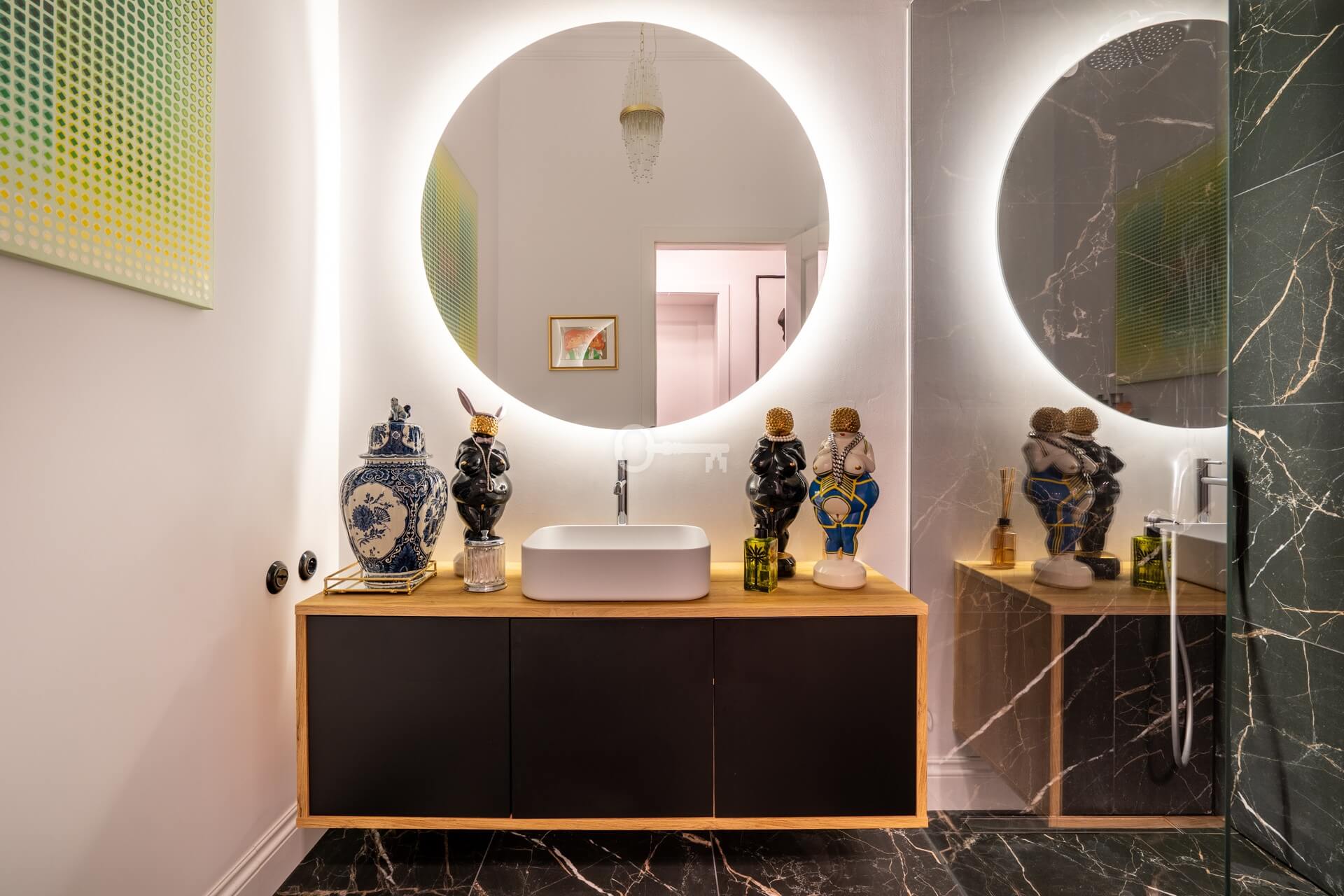 The bathroom is finished in an elegant, modern style: a walk-in shower, large-format black marble-effect tiles, and an illuminated mirror create an atmosphere of luxury and tranquility. This is an option for those seeking an aesthetically pleasing, meticulously crafted space with the soul of a tenement house, where art, architecture, and the comfort of everyday life create a cohesive whole.