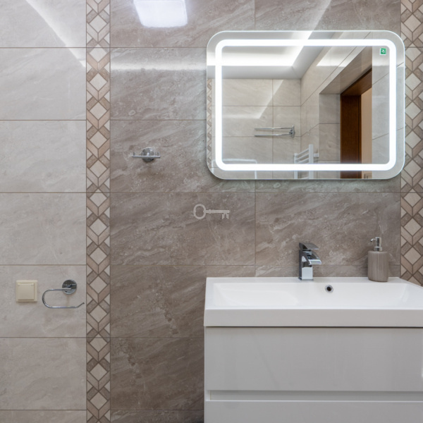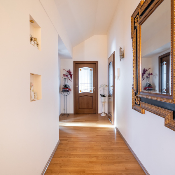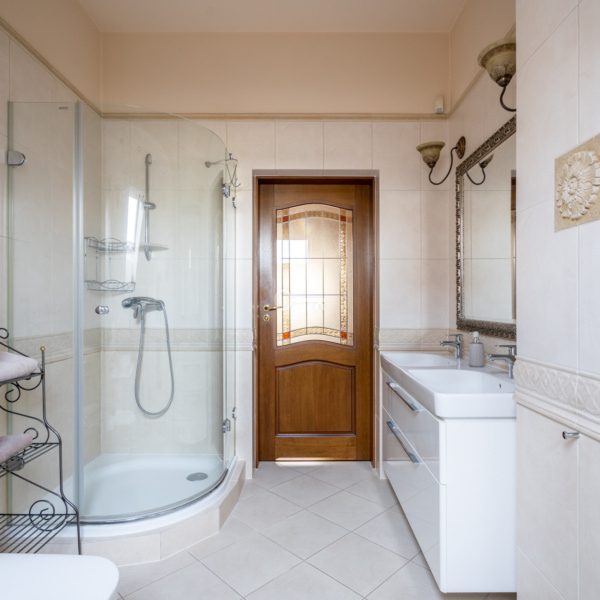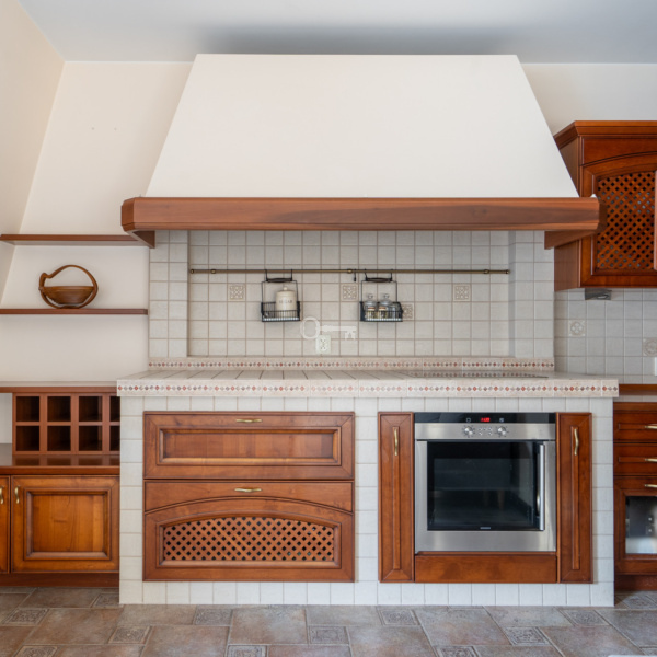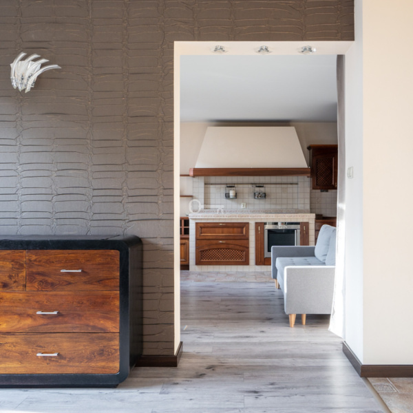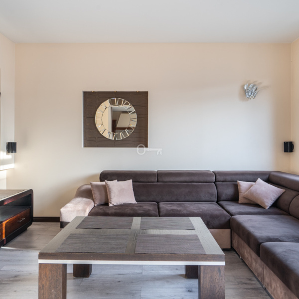 The living area is furnished with elegant wooden furniture and a sitting area with a comfortable corner sofa bed, coffee table, dresser and RTV cabinet. Leading from here is an exit to a sunny terrace with a southwestern exposure, overlooking the estate’s inner patio and greenery.