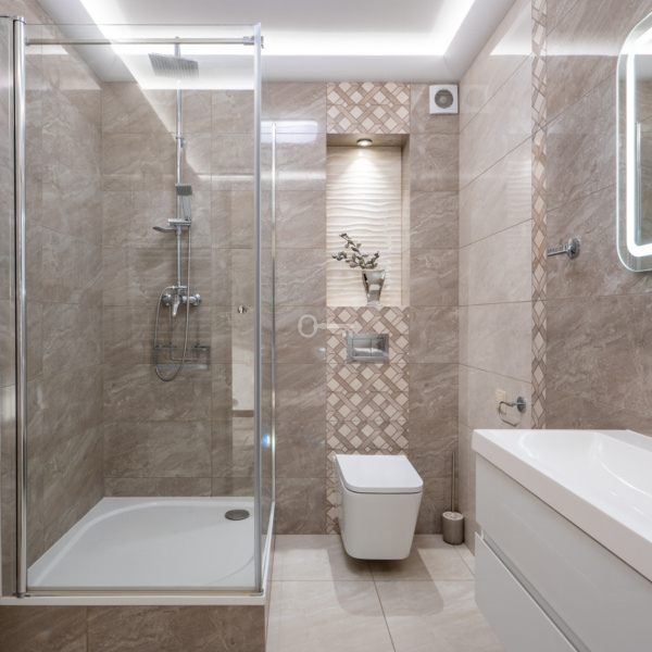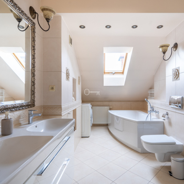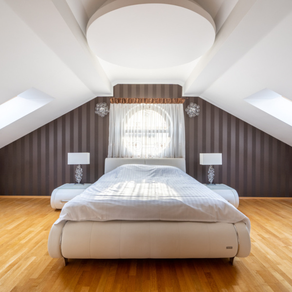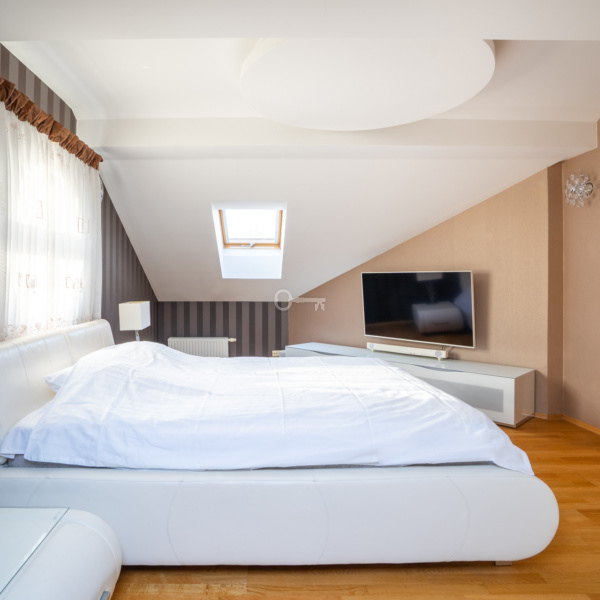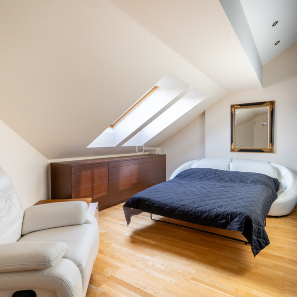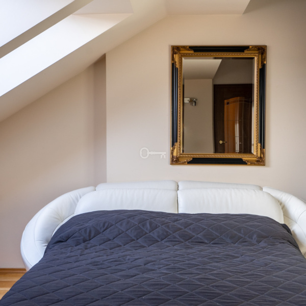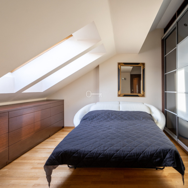 A bright and cozy bedroom equipped with a large, comfortable double bed, a guest bedroom with a capacious built-in closet, a dressing room and an elegant bathroom with a corner bathtub and shower have been arranged here.
