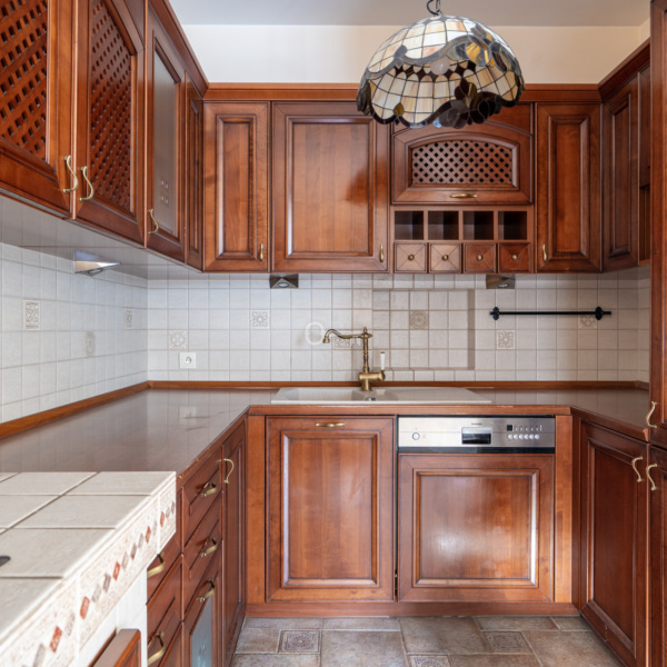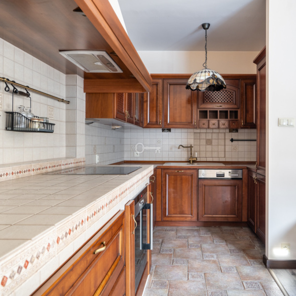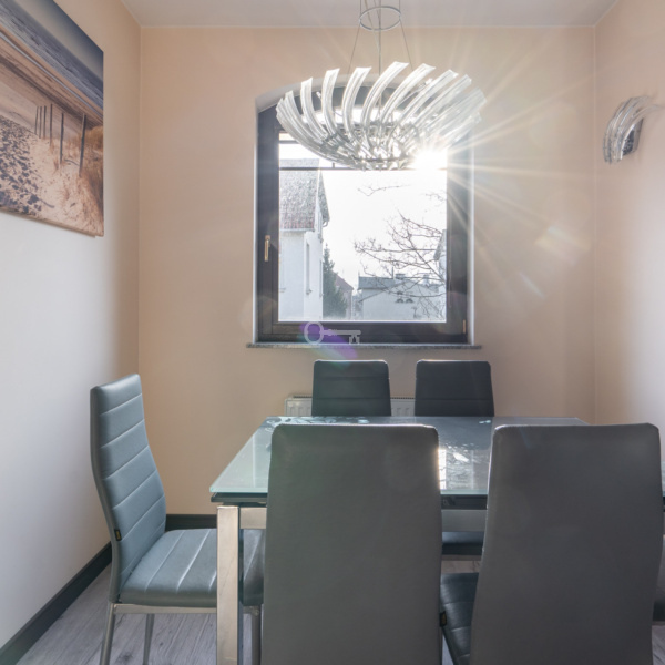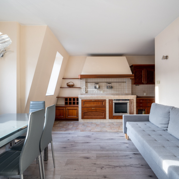 In the dining room, which has been discreetly separated from the kitchen area, there is a dining table with chairs, with room for 6 people, and a sofa bed. The kitchen was built with stylish brown wooden furniture and appliances (induction hob, hood, 60cm dishwasher, oven, refrigerator-freezer).