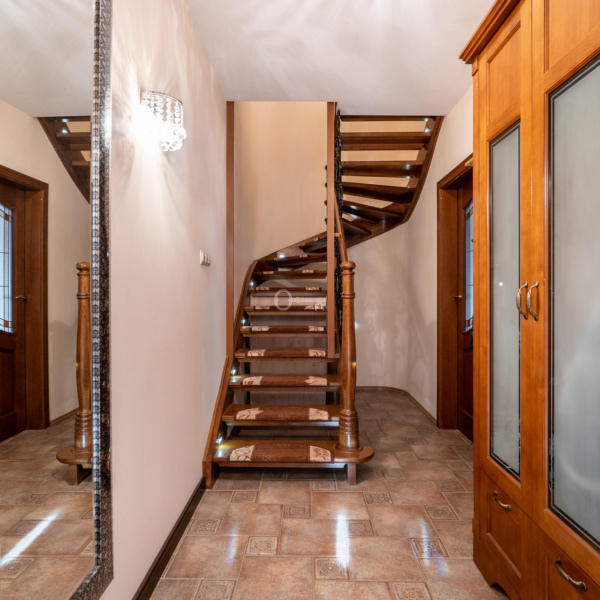 A wooden staircase leads to the upper floor, where around a comfortable hall are distributed: