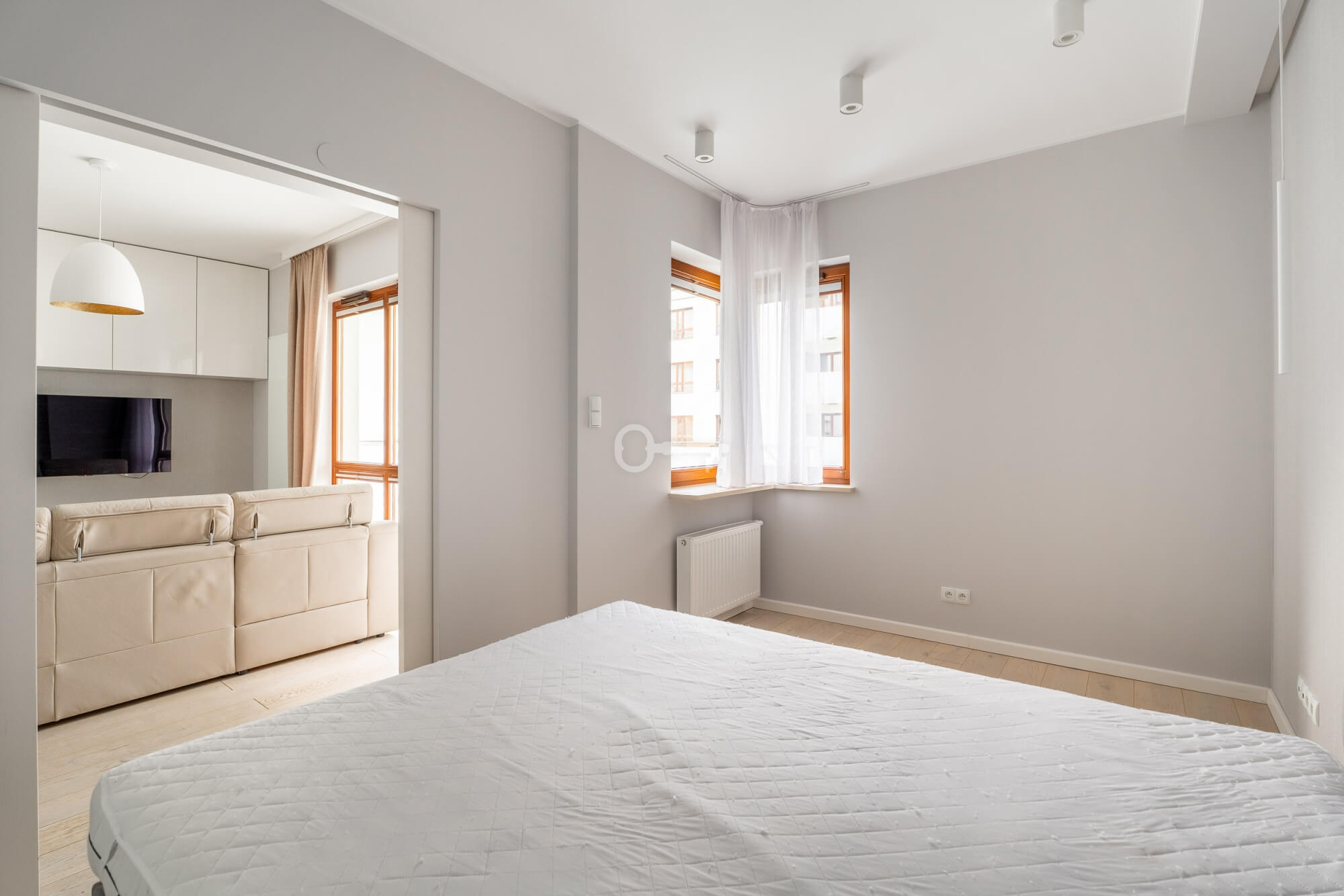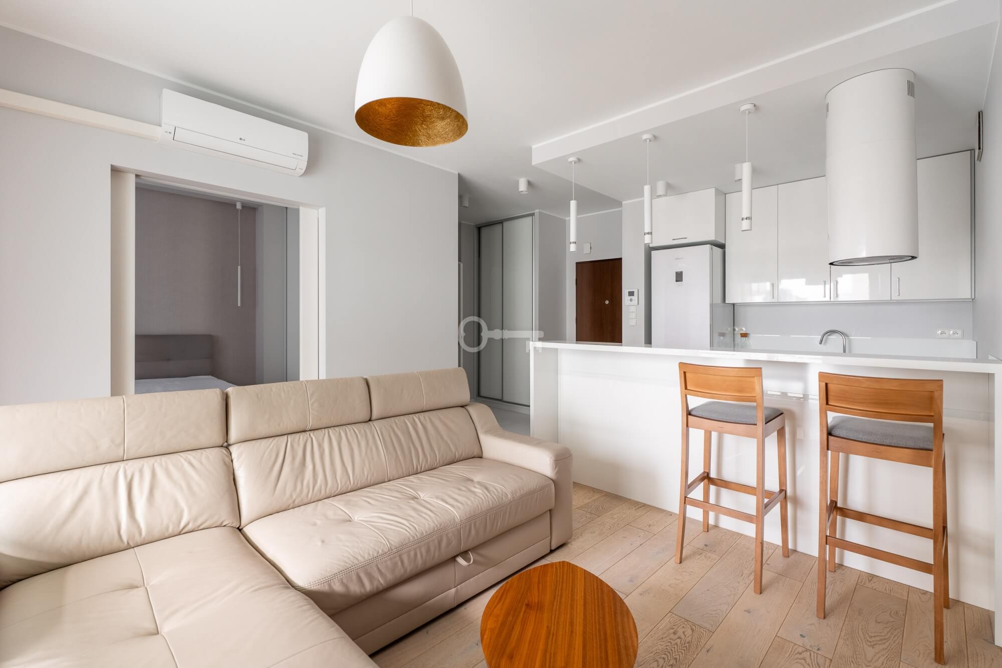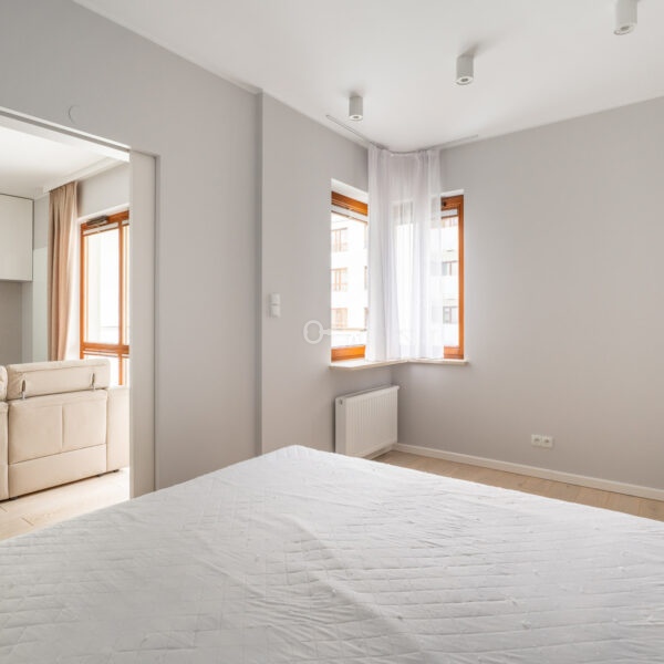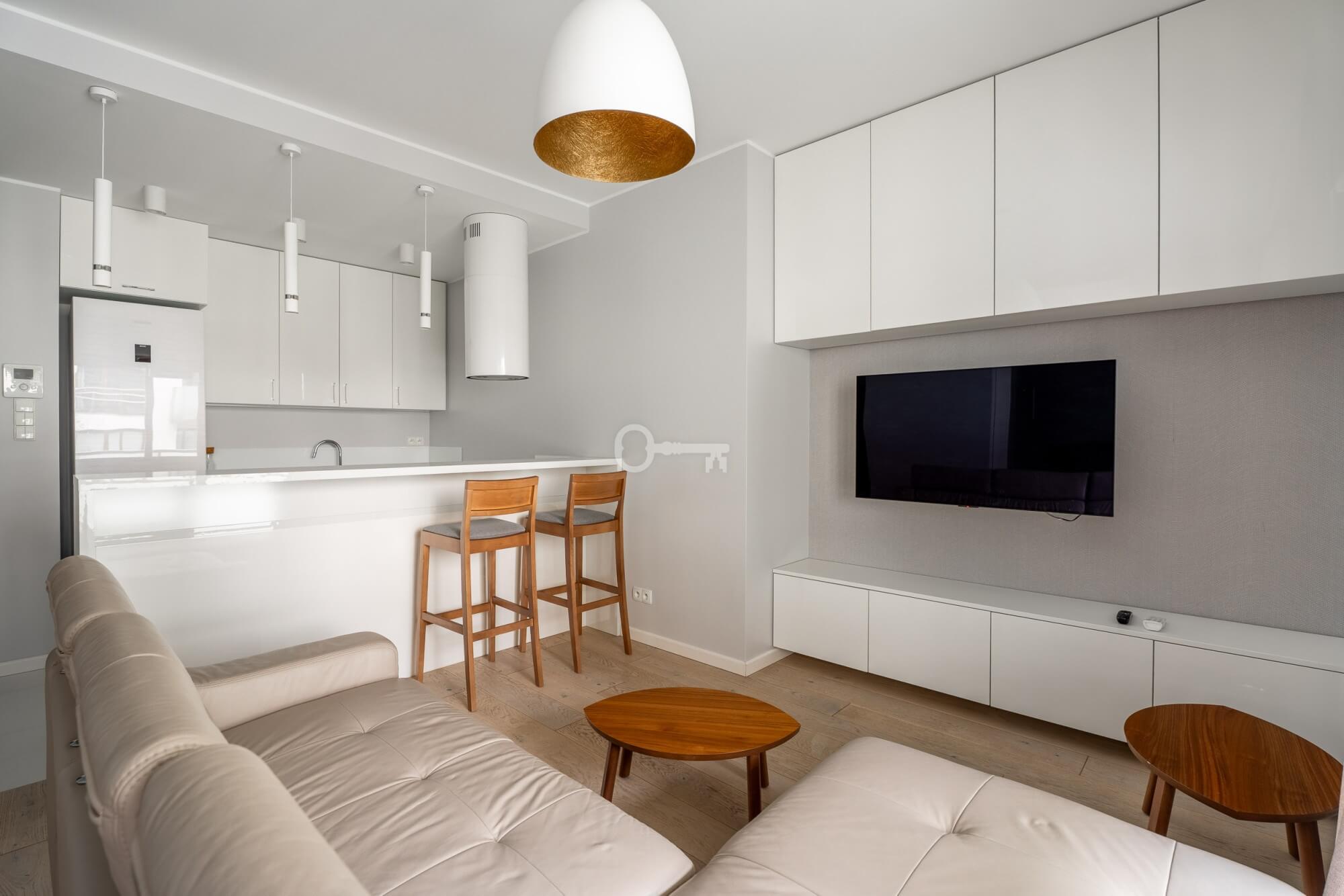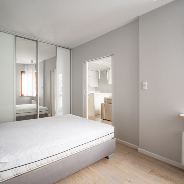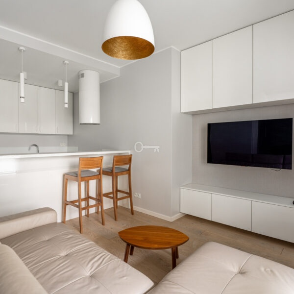 A modern and functional two-room flat, in a gated, monitored housing estate with security and a 24-hour reception. In the central part of the estate, there is a spacious, green courtyard with a playground and bicycle racks, providing residents with comfort and a sense of privacy.