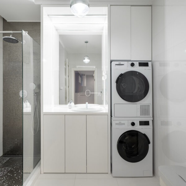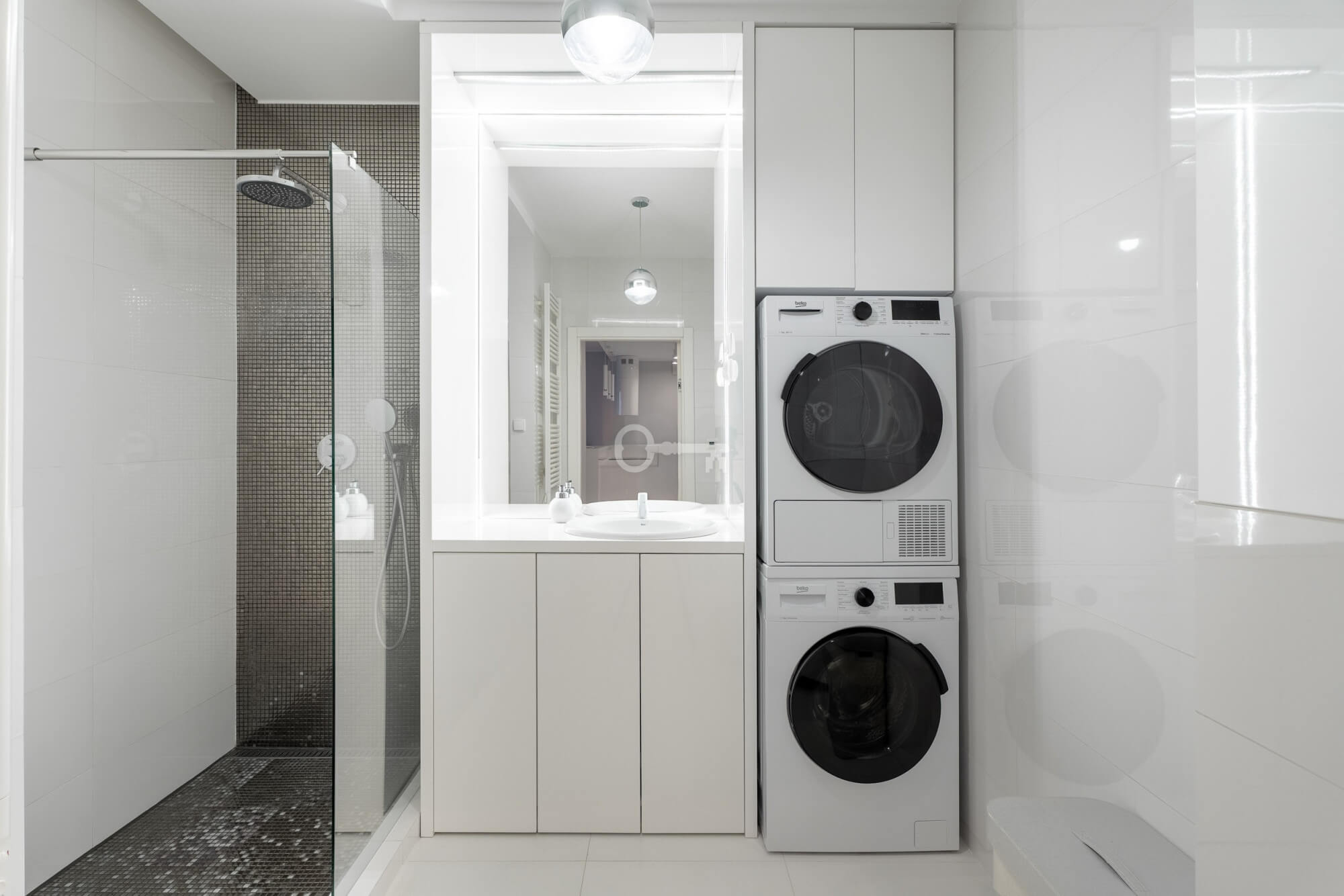 * a bathroom with a shower, washing machine and separate dryer,