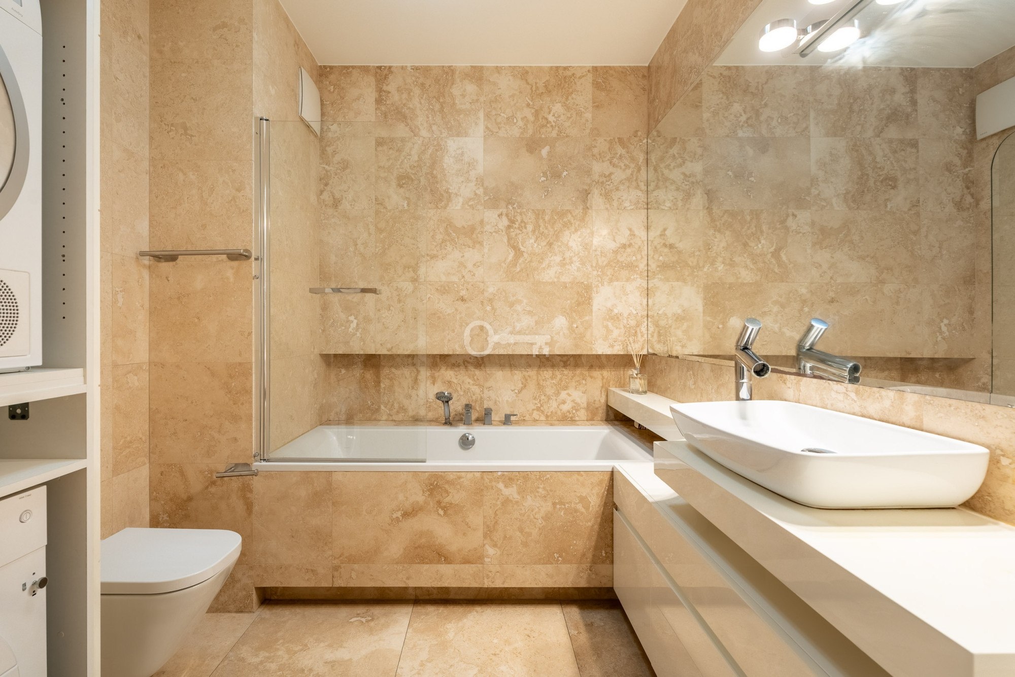 Two spacious bedrooms furnished with large double beds, nightstands, and wardrobes. The master bedroom features a walk-in wardrobe and private balcony, creating a cozy and intimate retreat. The second bathroom with a bathtub, located by the bedrooms, ensures comfort and privacy.