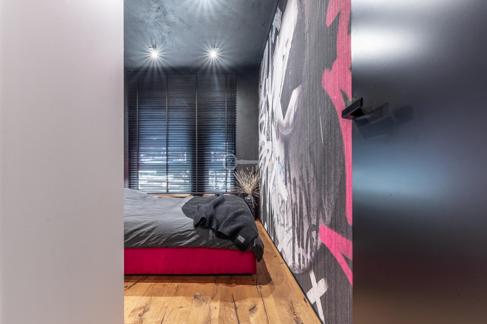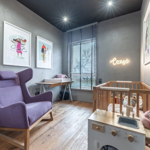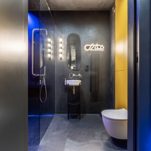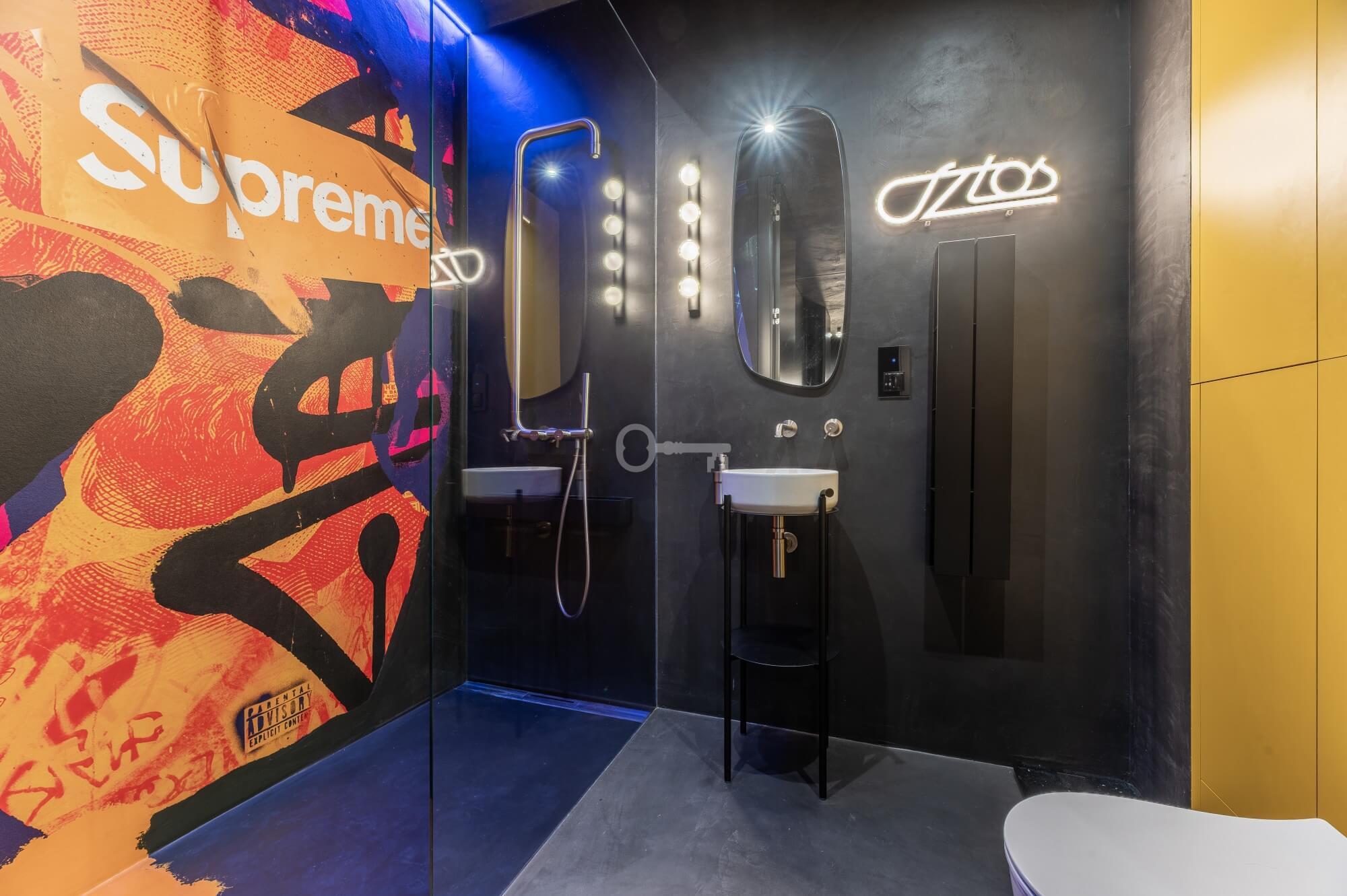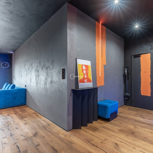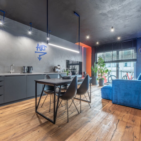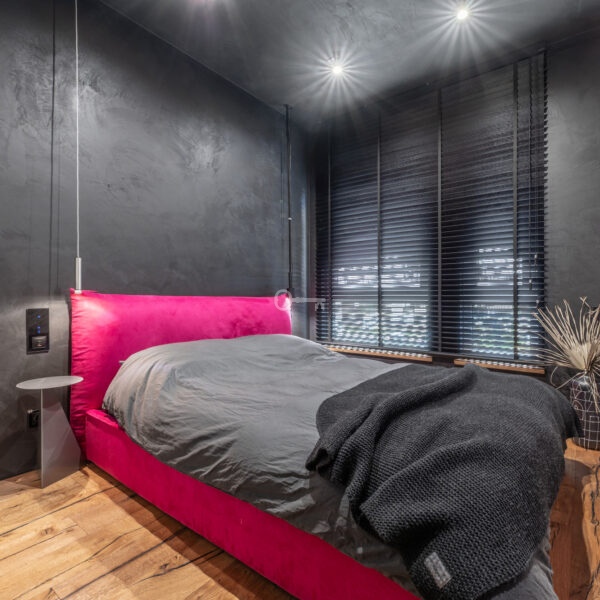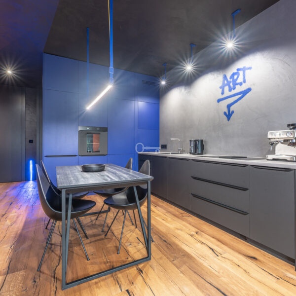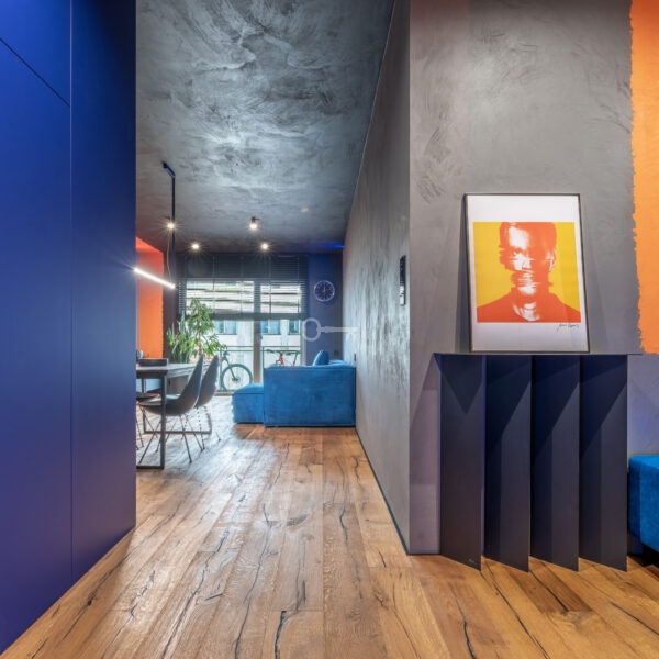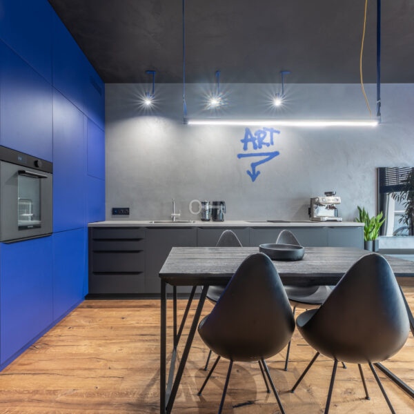 The interior of the apartment is dominated by raw textures (walls made of unpolished microcement) and deep, dark colors (anthracite, matte black), which provide the perfect backdrop for striking details. The walls are decorated with original graffiti, giving the space the character of a New York loft or avant-garde gallery. The dark interiors are deliberately broken up with strong neon accents – from the lush cobalt upholstery in the living room and the fuchsia-colored headboard to the multicolor RGBW LED lighting controlled by an app – the lighting creates a dynamic, club-like atmosphere. Touch switches with a glass panel from “Kontakt Simon” improve the organization of lighting in the apartment.