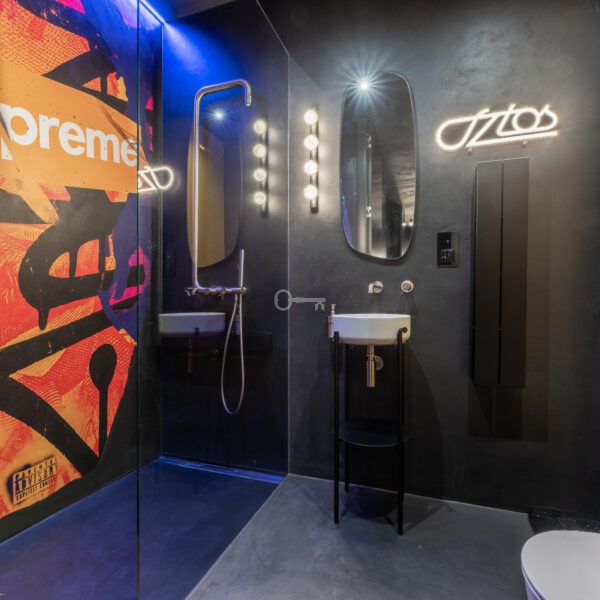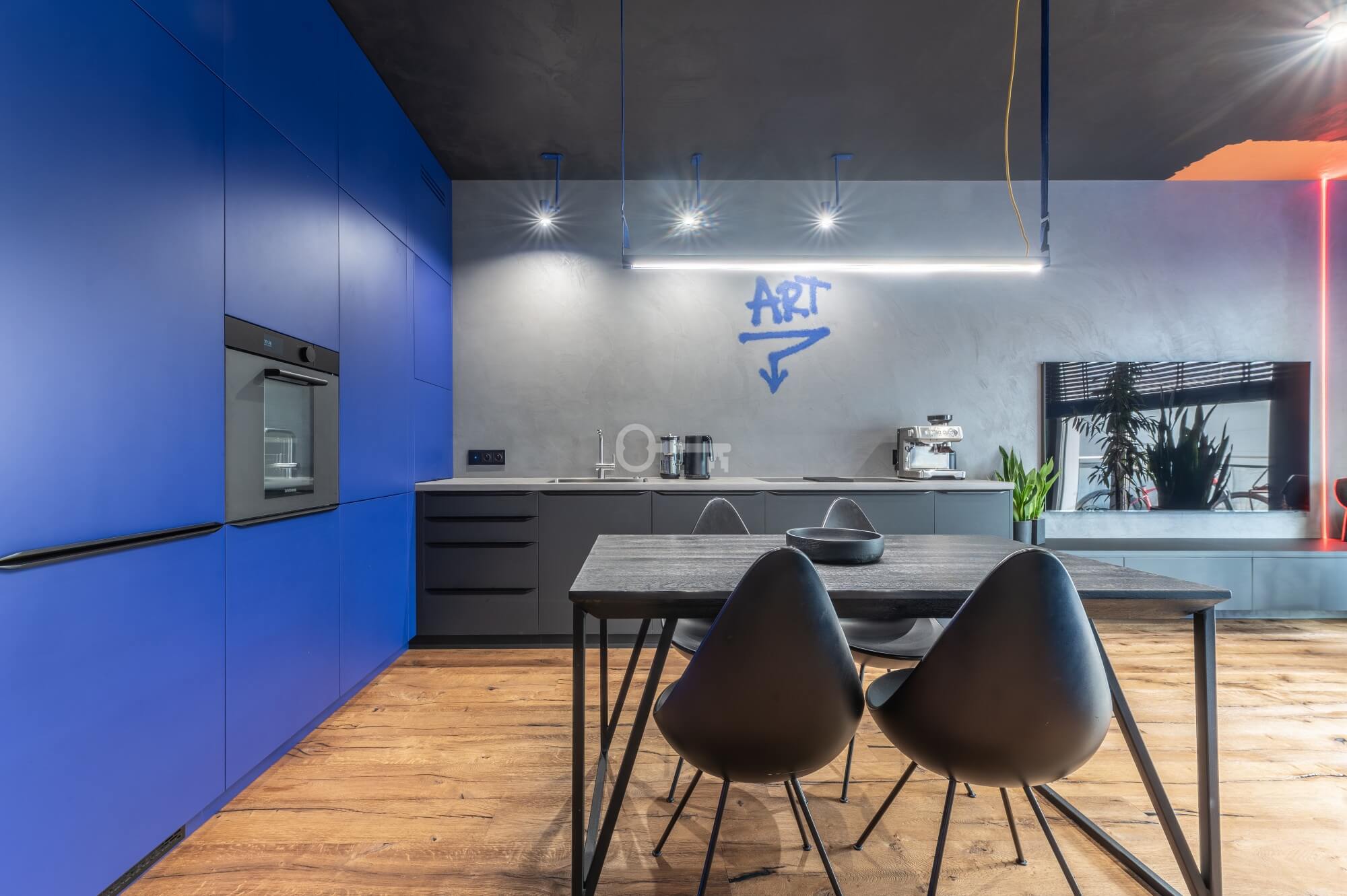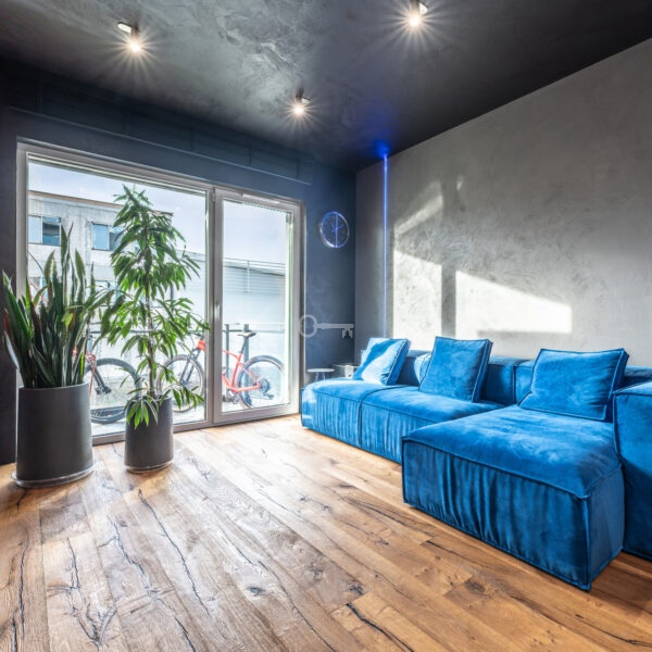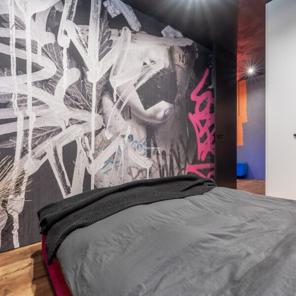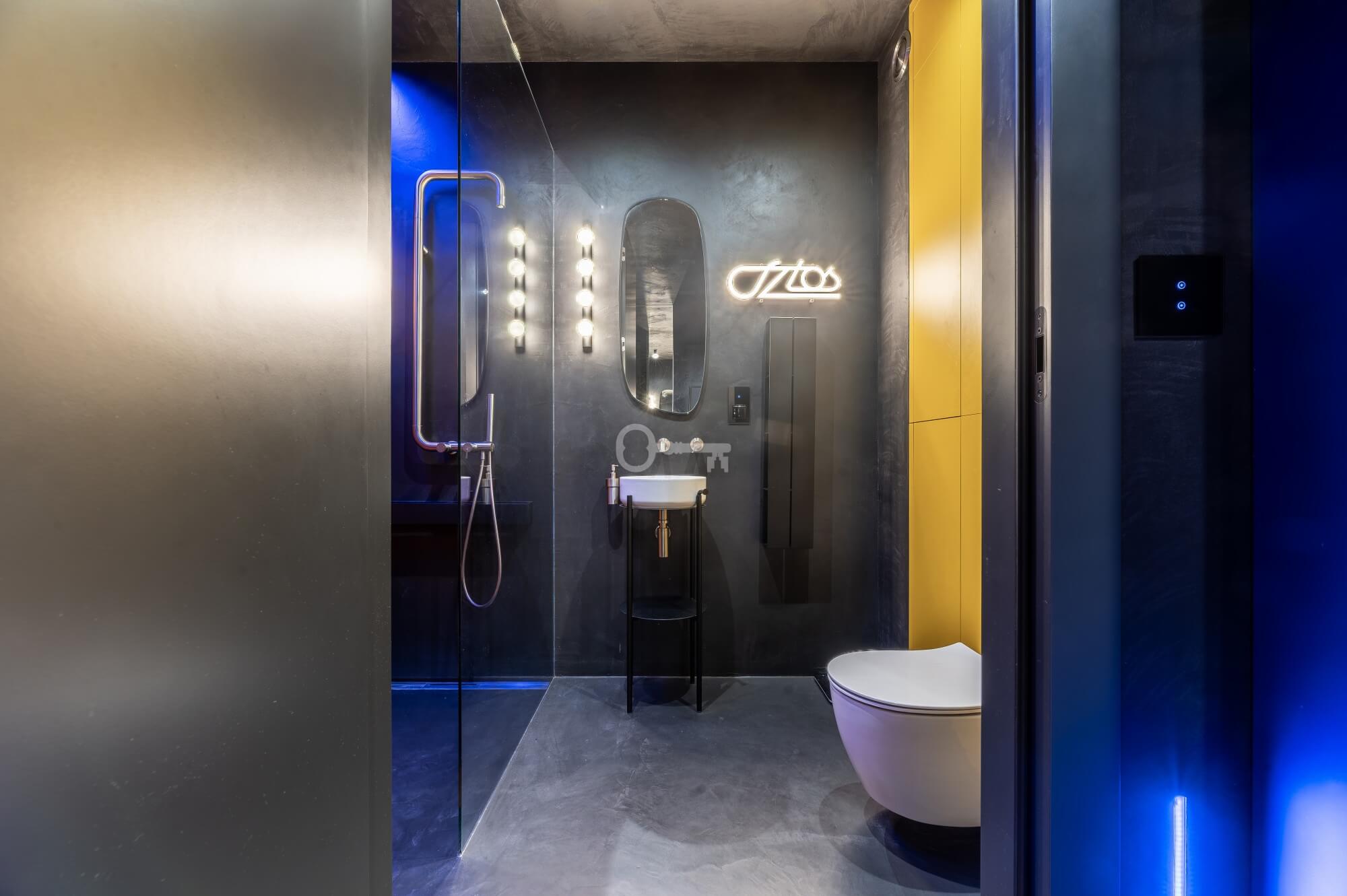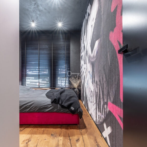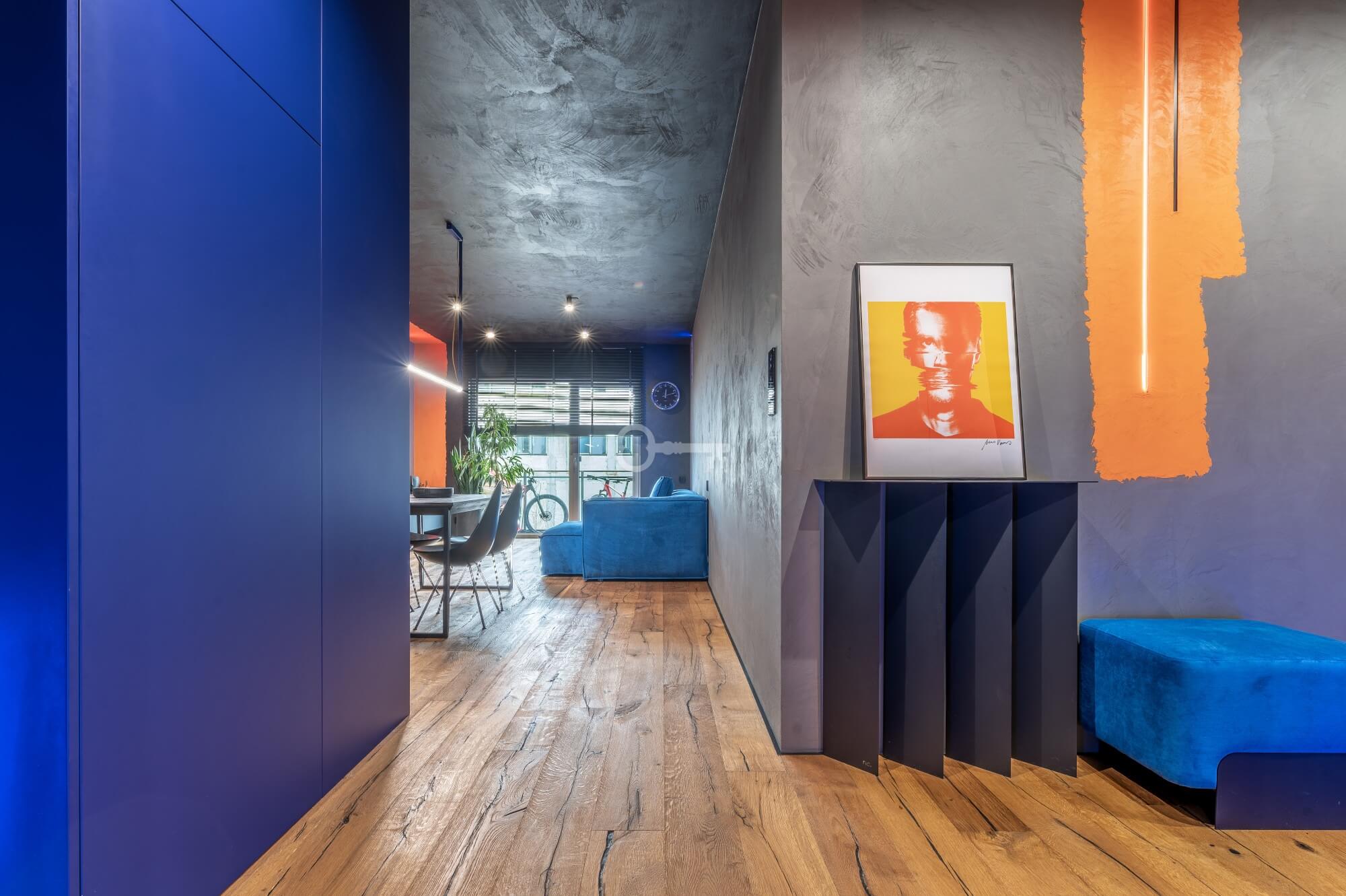 The interior of the apartment is dominated by raw textures (walls made of unpolished microcement) and deep, dark colors (anthracite, matte black), which provide the perfect backdrop for striking details. The walls are decorated with original graffiti, giving the space the character of a New York loft or avant-garde gallery. The dark interiors are deliberately broken up with strong neon accents – from the lush cobalt upholstery in the living room and the fuchsia-colored headboard to the multicolor RGBW LED lighting controlled by an app – the lighting creates a dynamic, club-like atmosphere. Touch switches with a glass panel from “Kontakt Simon” improve the organization of lighting in the apartment.