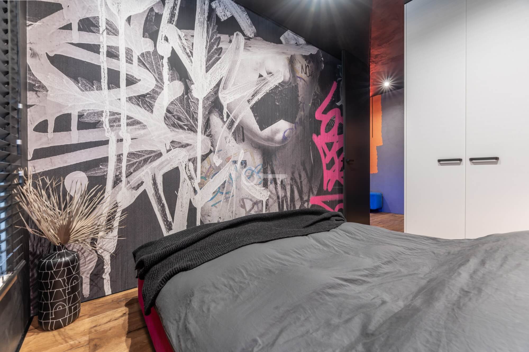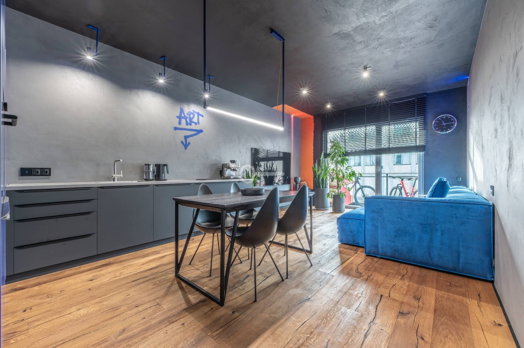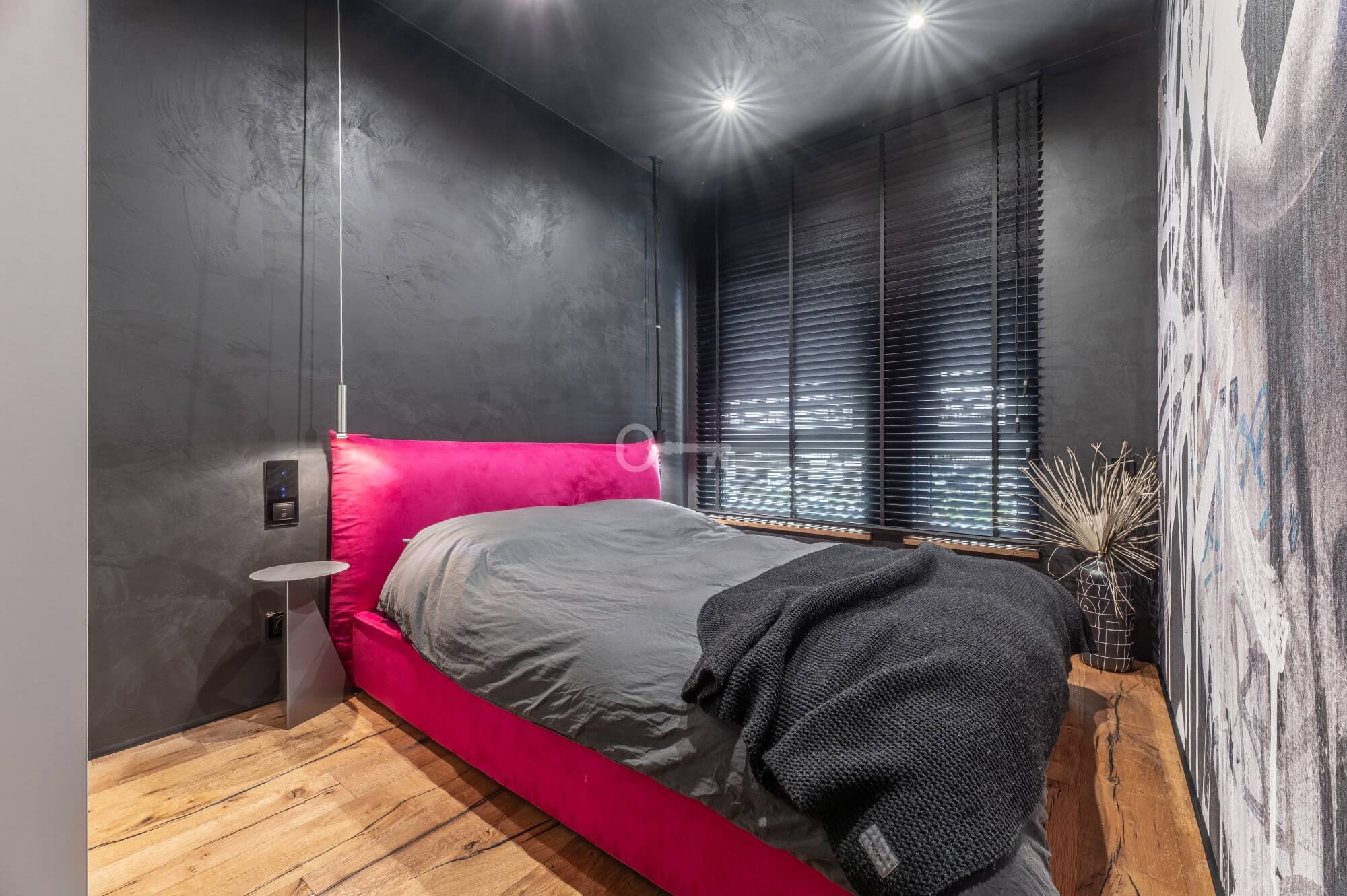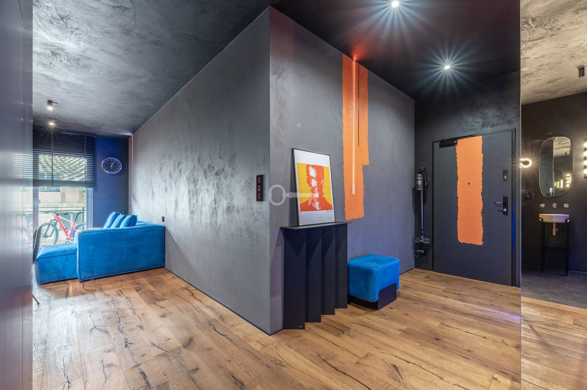 The interior of the apartment is dominated by raw textures (walls made of unpolished microcement) and deep, dark colors (anthracite, matte black), which provide the perfect backdrop for striking details. The walls are decorated with original graffiti, giving the space the character of a New York loft or avant-garde gallery. The dark interiors are deliberately broken up with strong neon accents – from the lush cobalt upholstery in the living room and the fuchsia-colored headboard to the multicolor RGBW LED lighting controlled by an app – the lighting creates a dynamic, club-like atmosphere. Touch switches with a glass panel from “Kontakt Simon” improve the organization of lighting in the apartment.