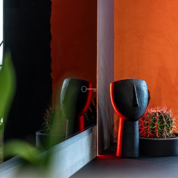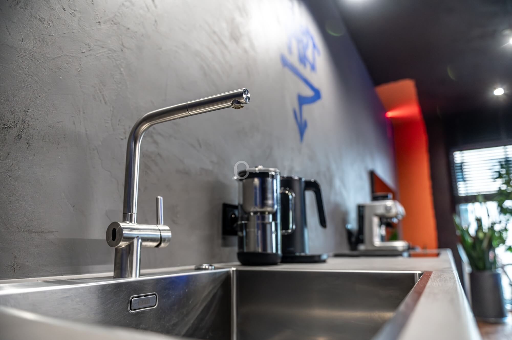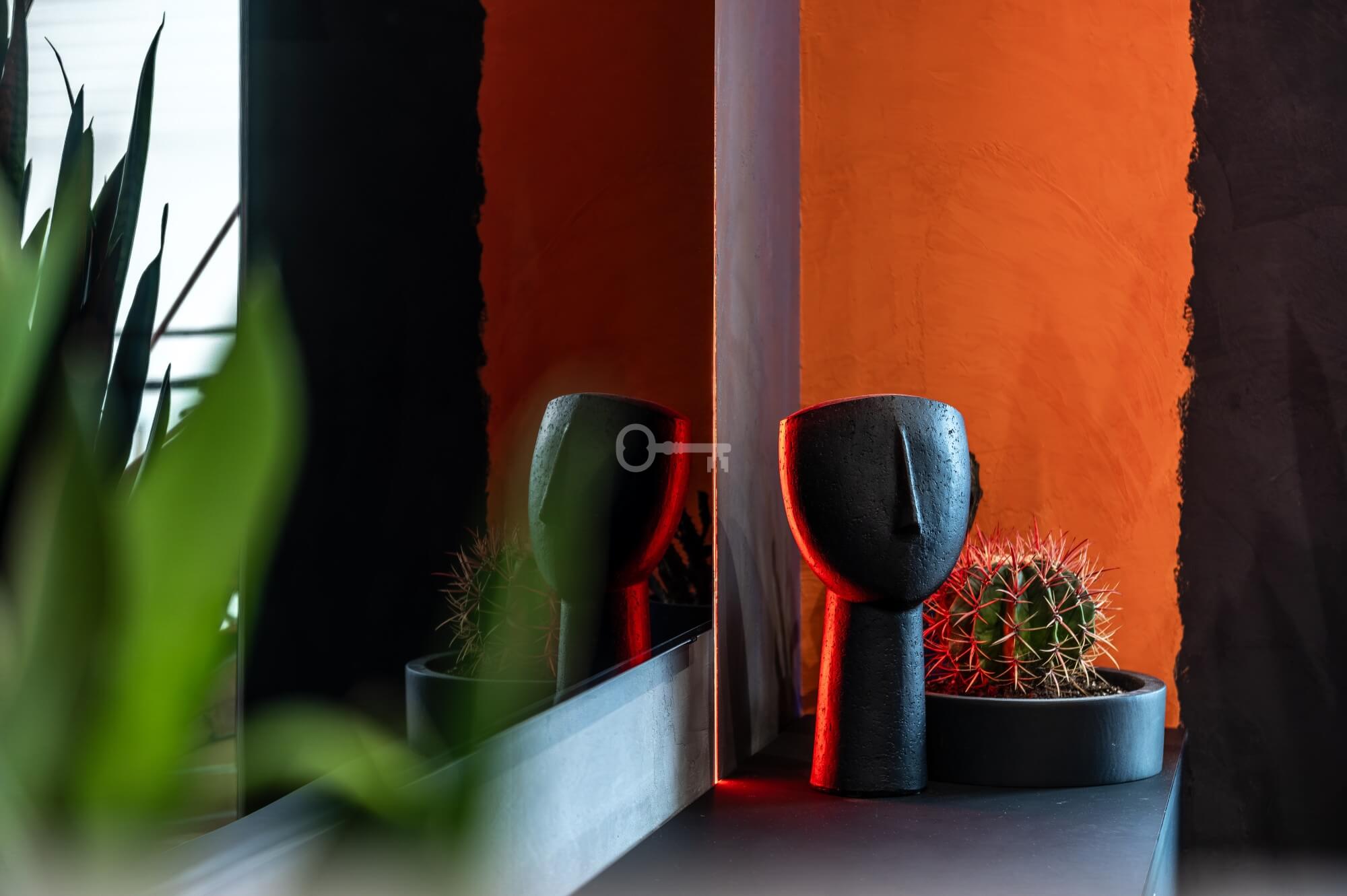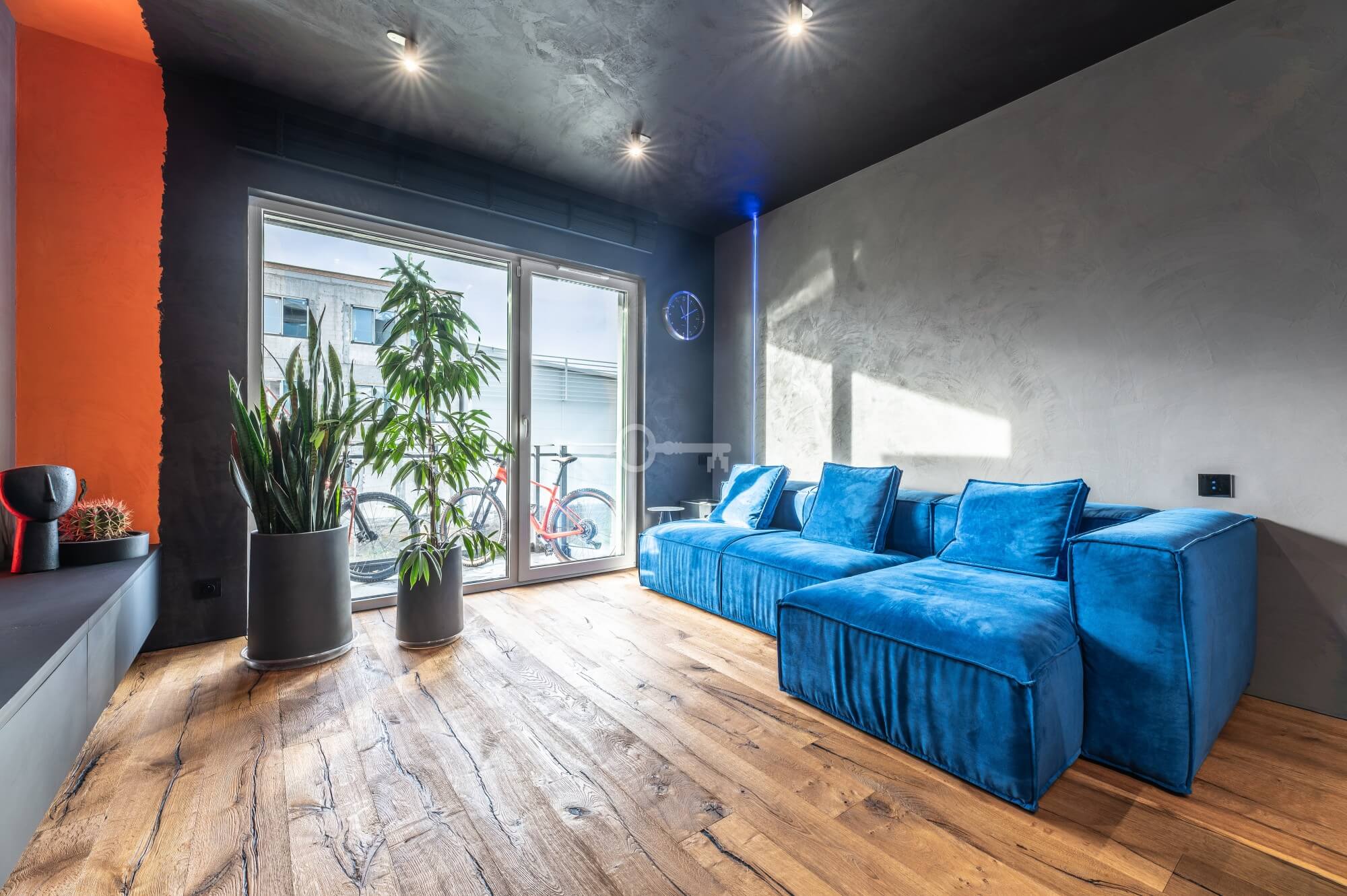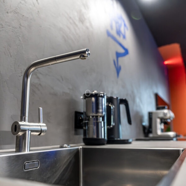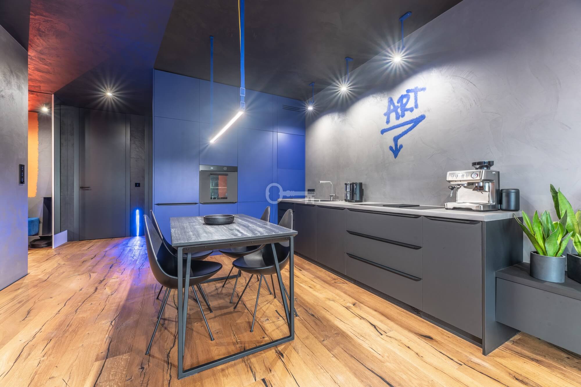 The interior of the apartment is dominated by raw textures (walls made of unpolished microcement) and deep, dark colors (anthracite, matte black), which provide the perfect backdrop for striking details. The walls are decorated with original graffiti, giving the space the character of a New York loft or avant-garde gallery. The dark interiors are deliberately broken up with strong neon accents – from the lush cobalt upholstery in the living room and the fuchsia-colored headboard to the multicolor RGBW LED lighting controlled by an app – the lighting creates a dynamic, club-like atmosphere. Touch switches with a glass panel from “Kontakt Simon” improve the organization of lighting in the apartment.