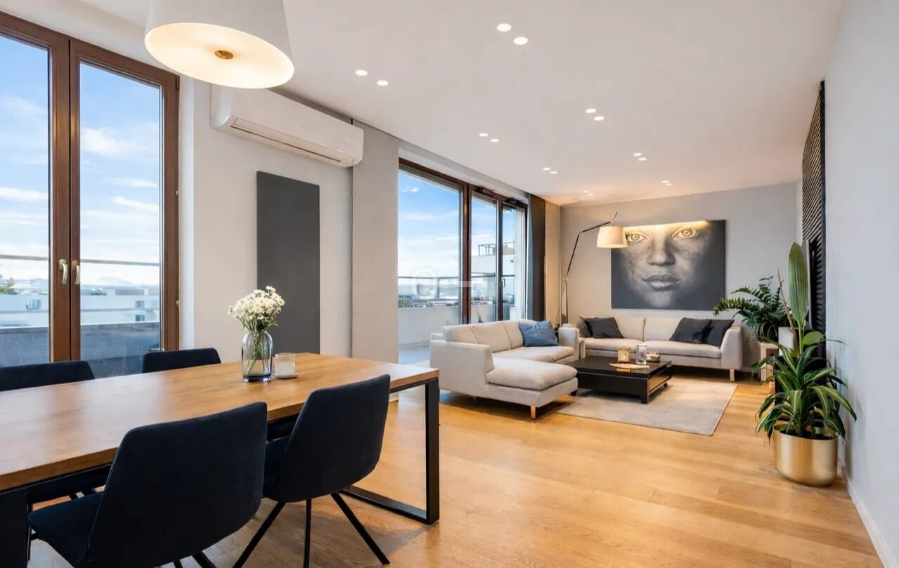 * A spacious living room with large windows and access to a 60m² viewing terrace,