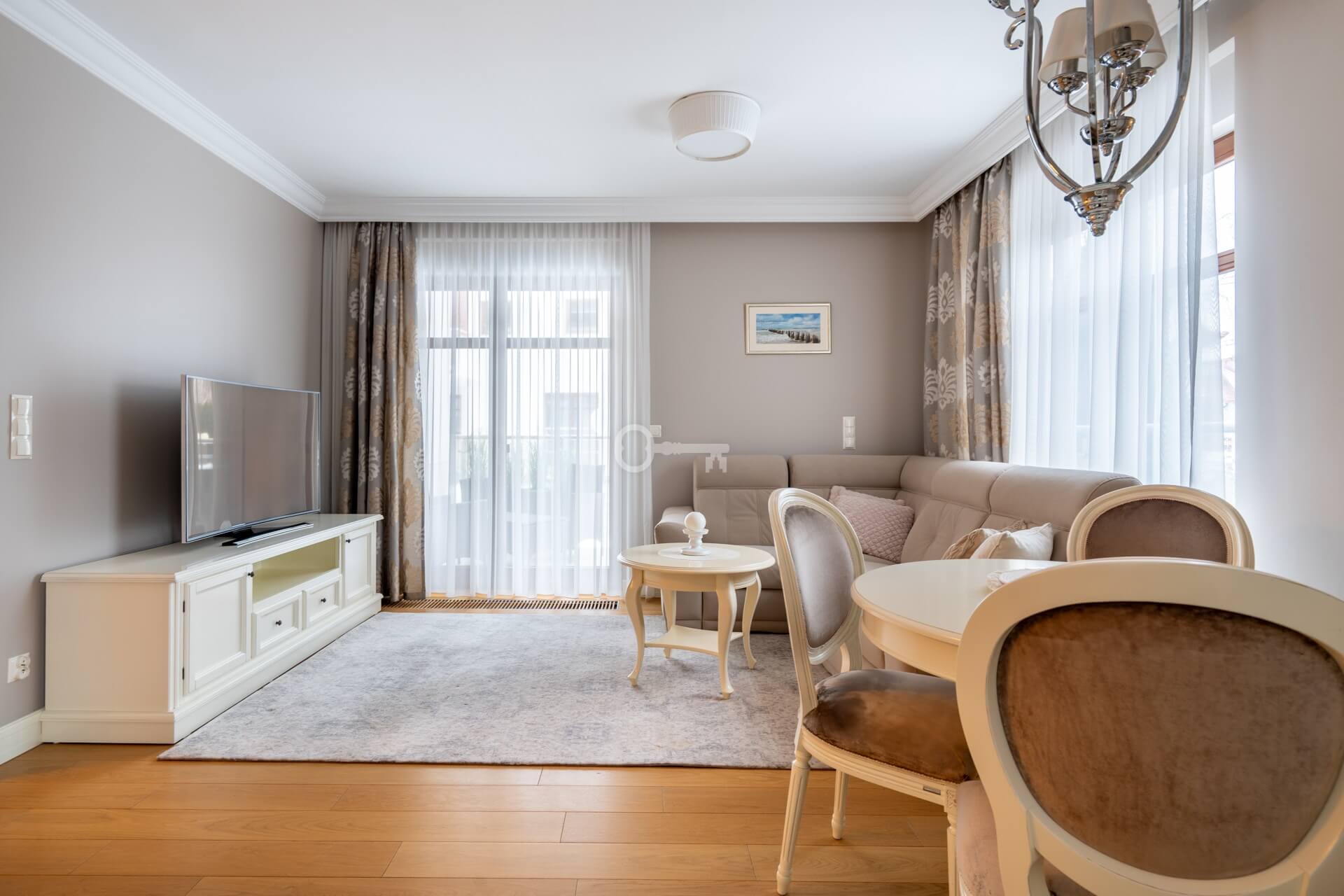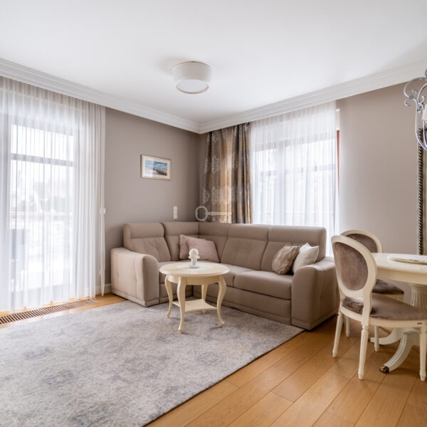 A two-room apartment finished to a high standard, located in the “Apartamenty Przy Plaży” residential development on Jelitkowska Street, on the border of Gdańsk and Sopot. The development is distinguished by its intimate, low-rise buildings situated just a few steps from the sea, surrounded by greenery and close to seaside walking routes and the attractions of the Tri-City area.