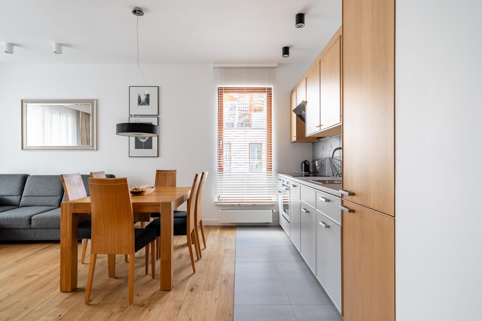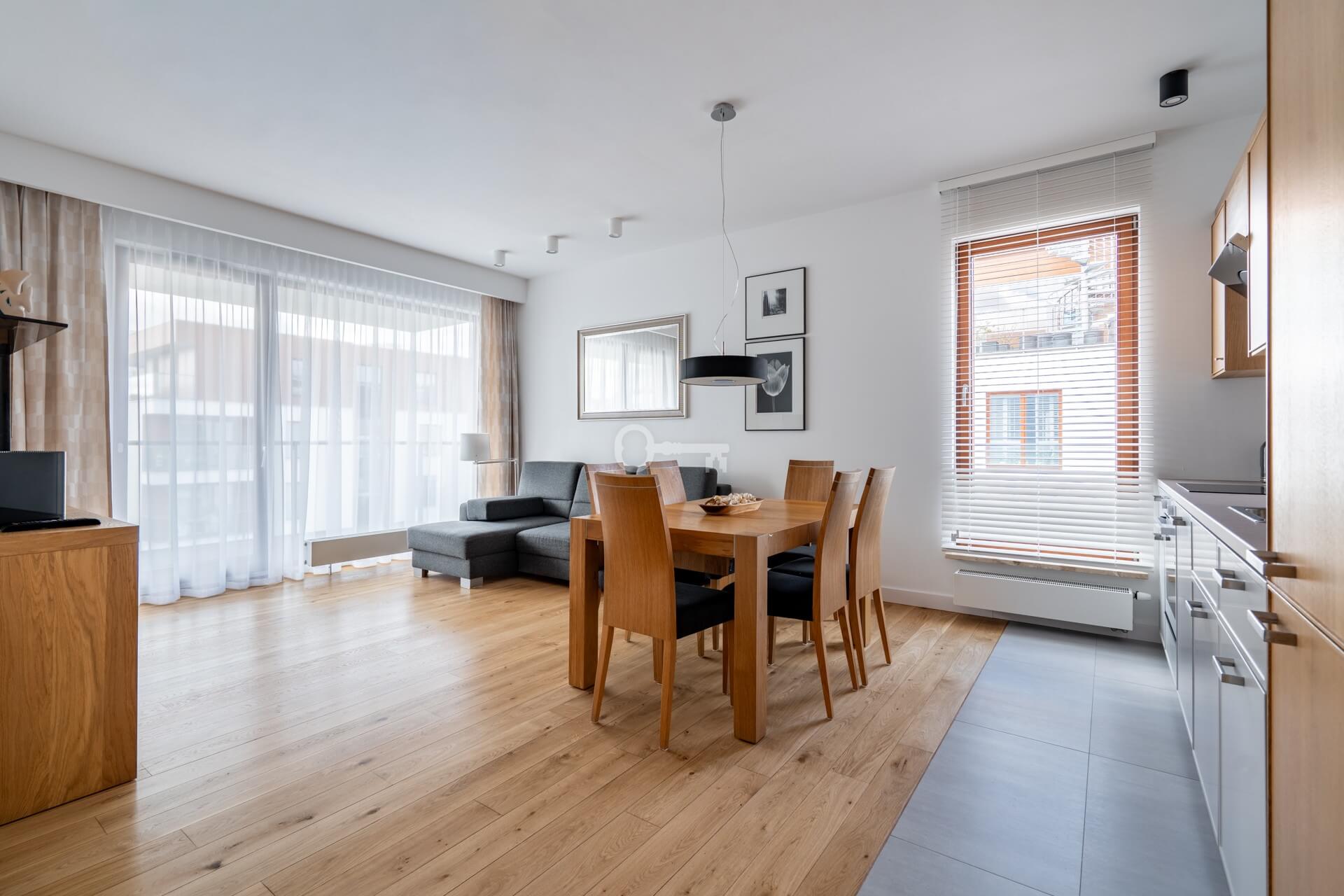 The spacious living room with an open-plan kitchen forms the heart of the apartment and serves as a natural daily living space. The functional layout ensures comfort for both couples and families.