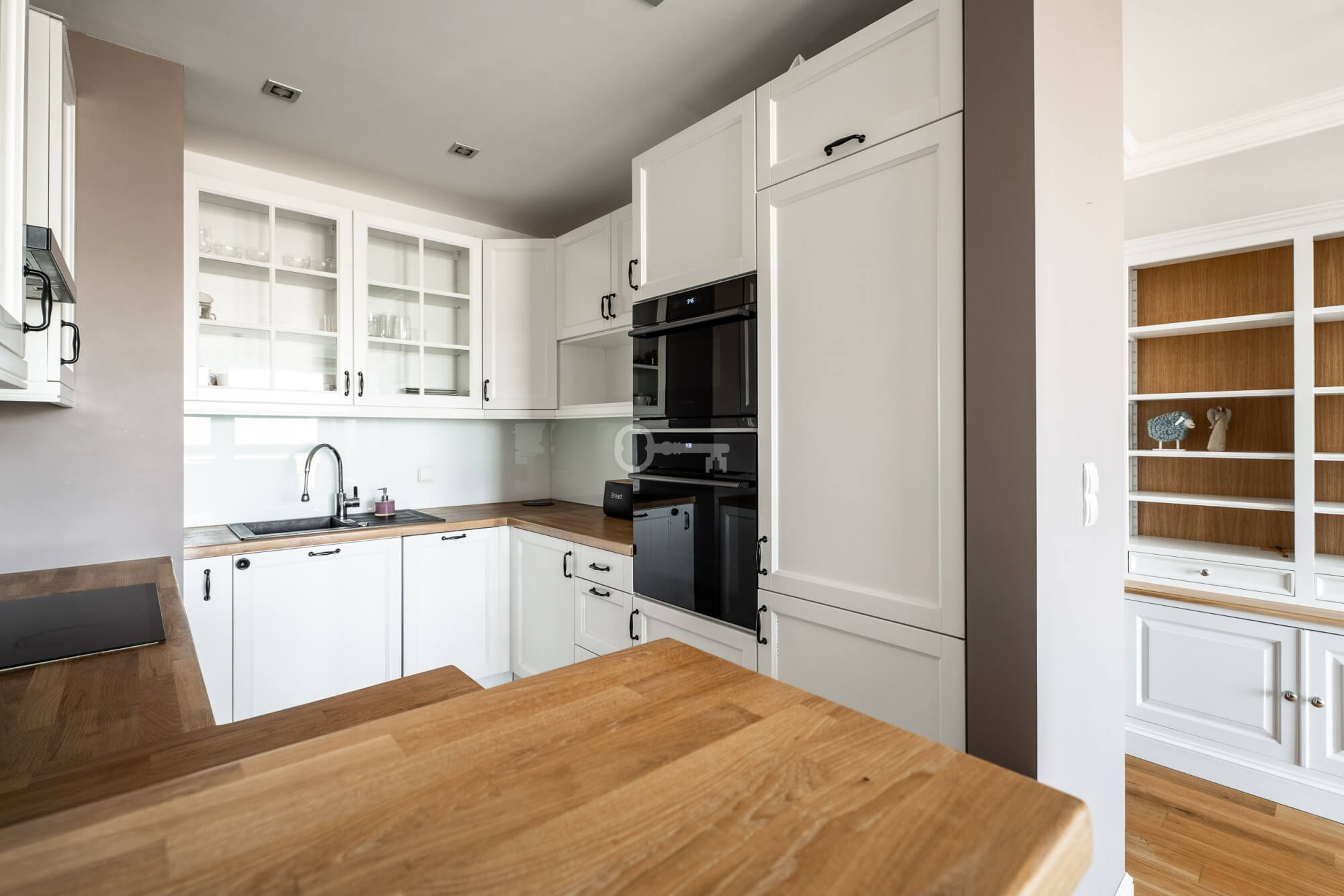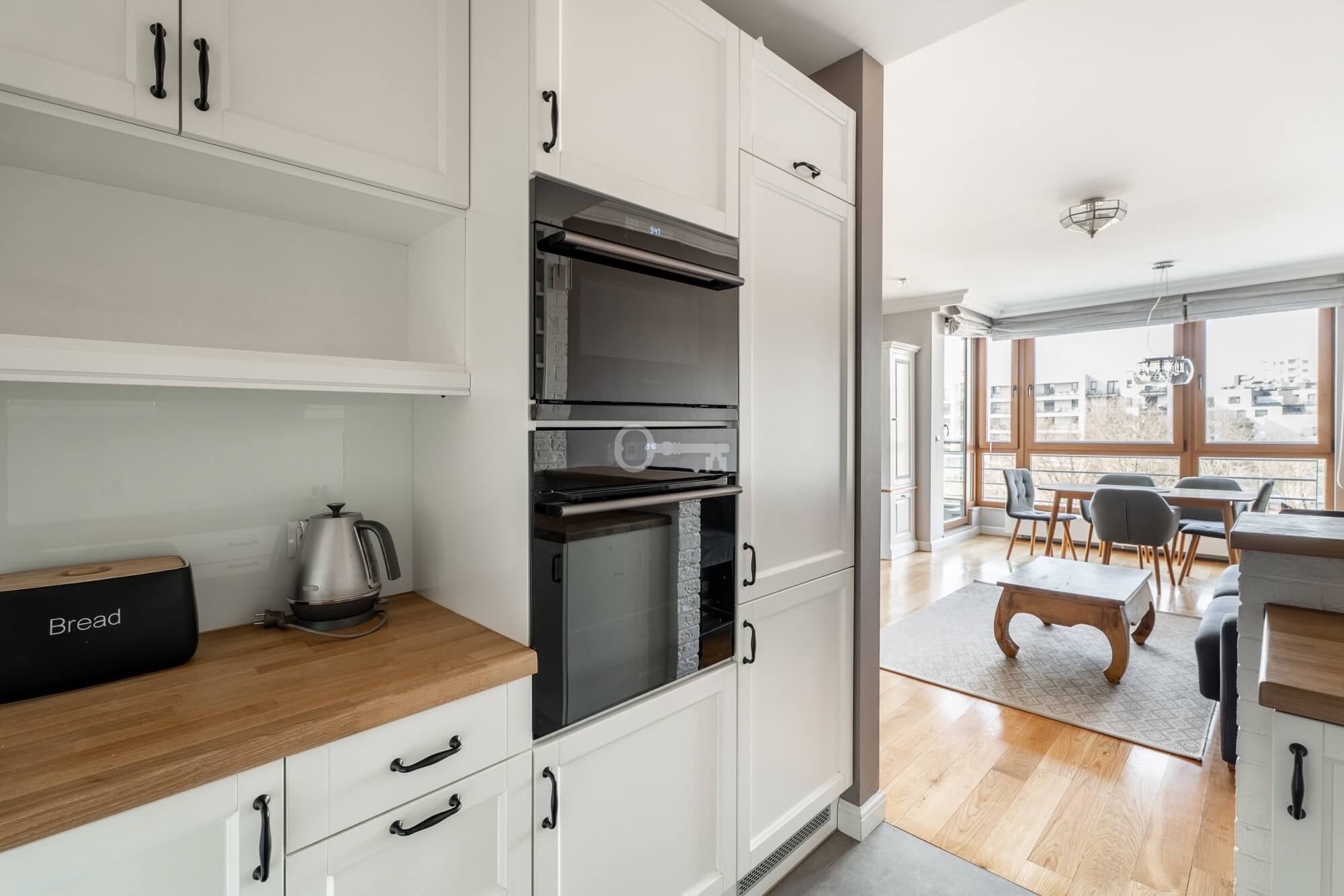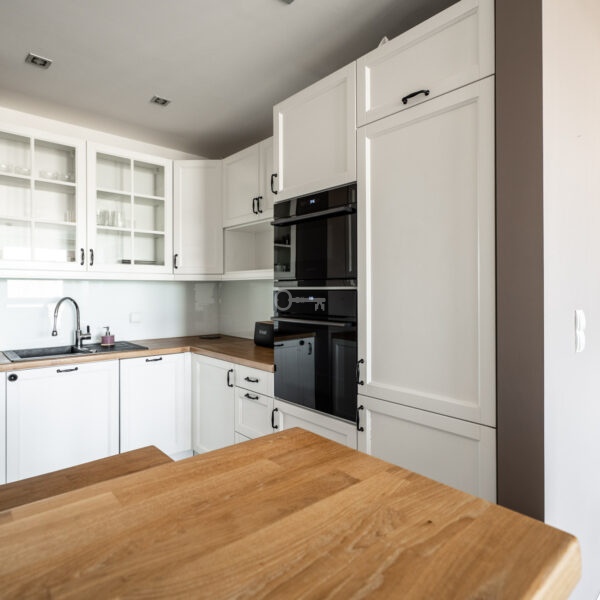 Natural wood plays a central role here—oak flooring and carefully selected rosewood furniture create an elegant, warm, and timeless space. Large windows and a west-facing orientation ensure excellent natural light inside and beautiful, atmospheric light at sunset.