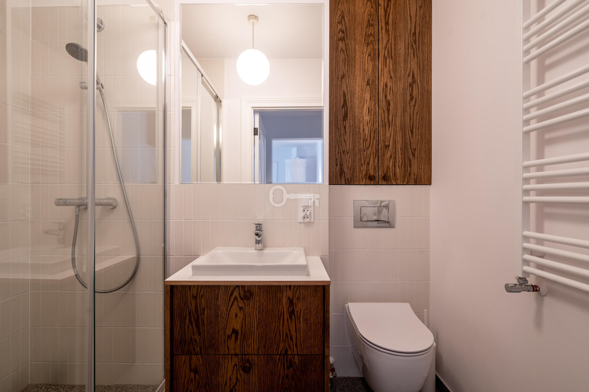 The bathroom is finished in an elegant, modern style: a walk-in shower with pleasant Scandinavian details.