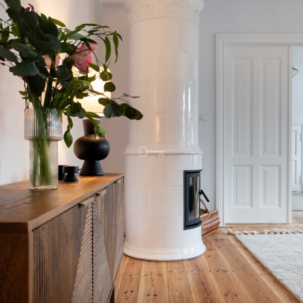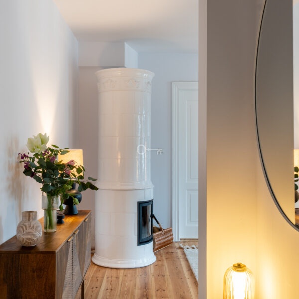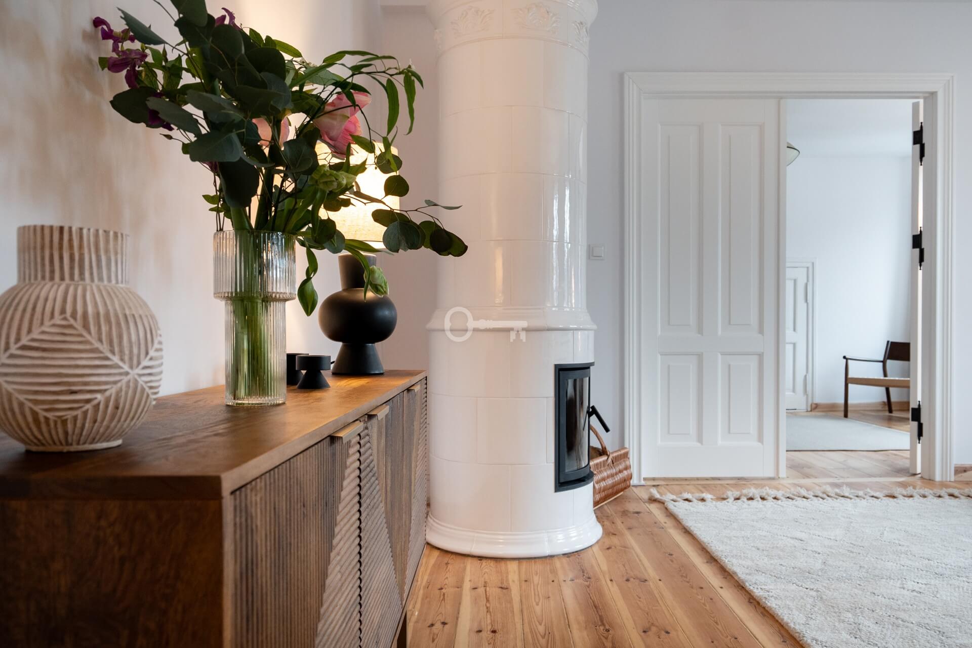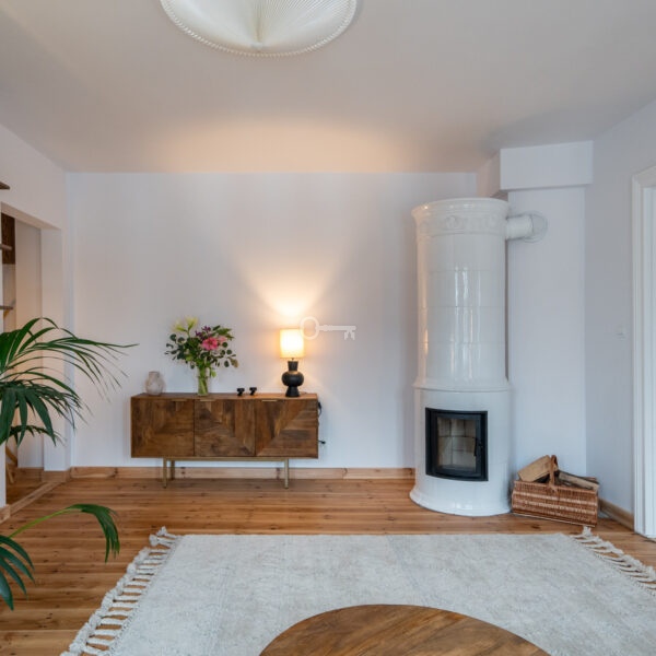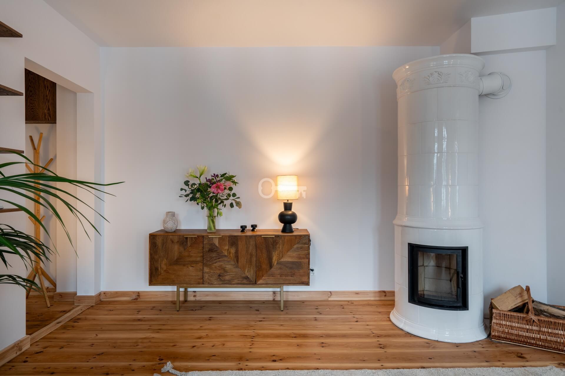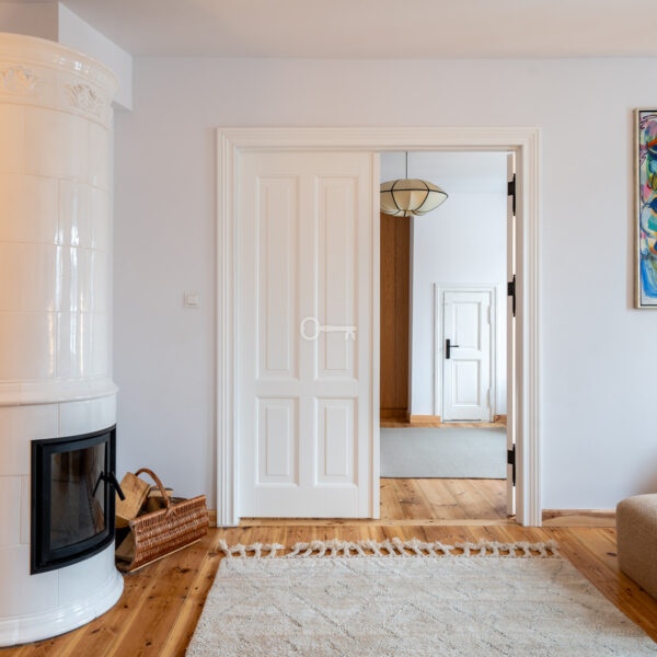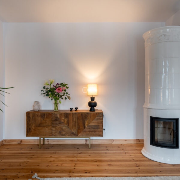 The living room features a magnificent and functioning Swedish tiled stove – handmade tiles, Kaflarnia Grochowski, Poland. The stove is made exclusively of natural materials.
