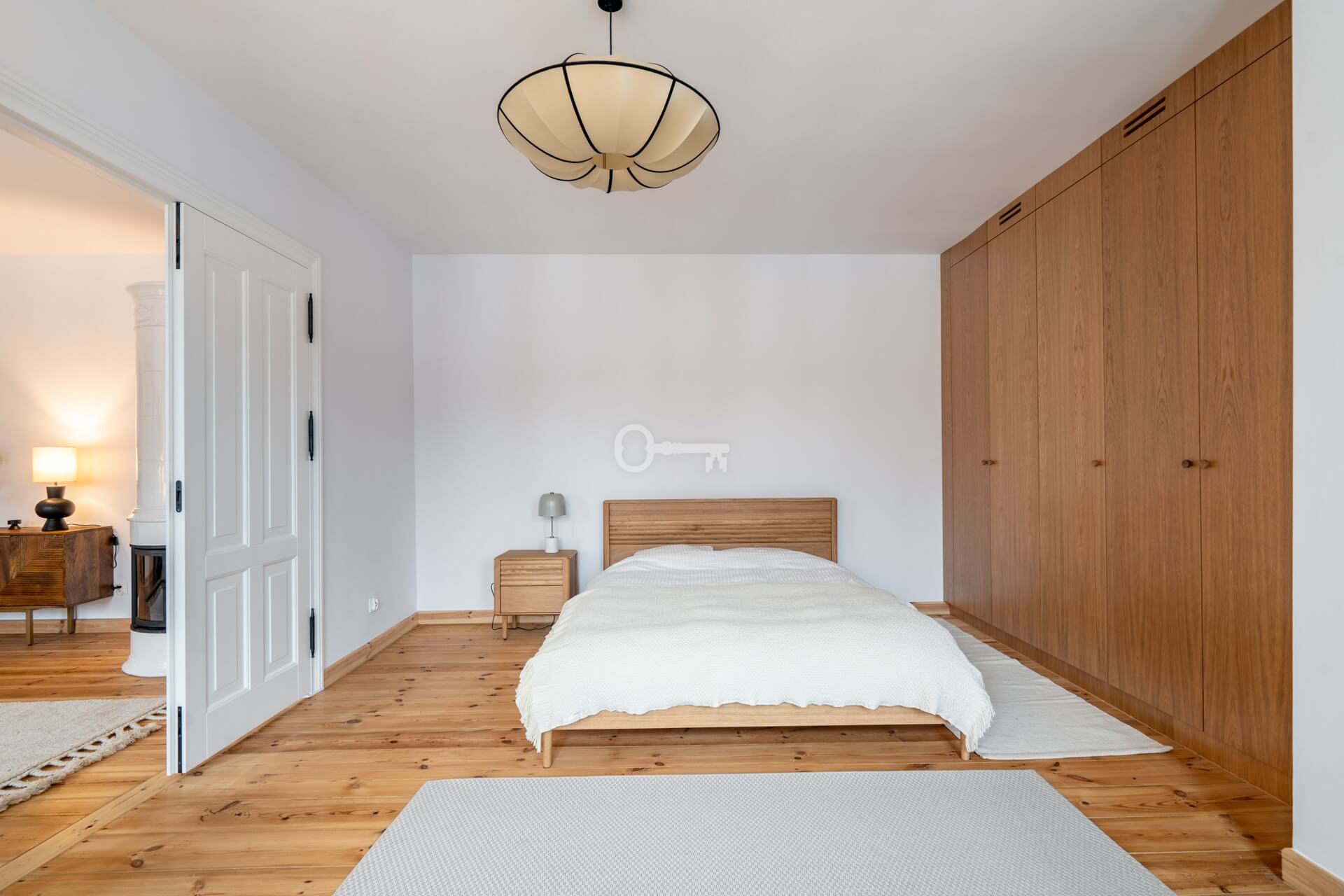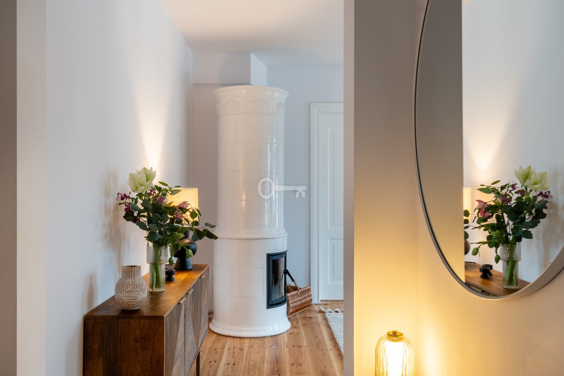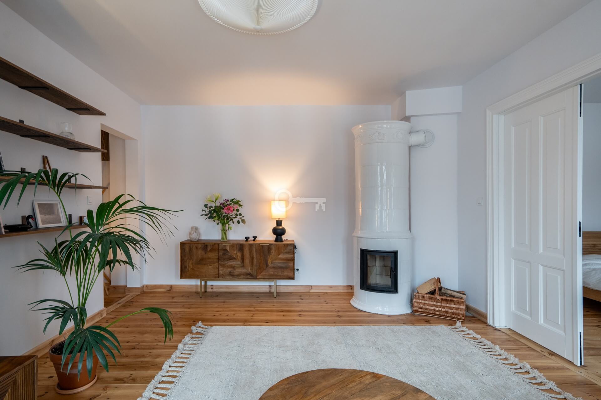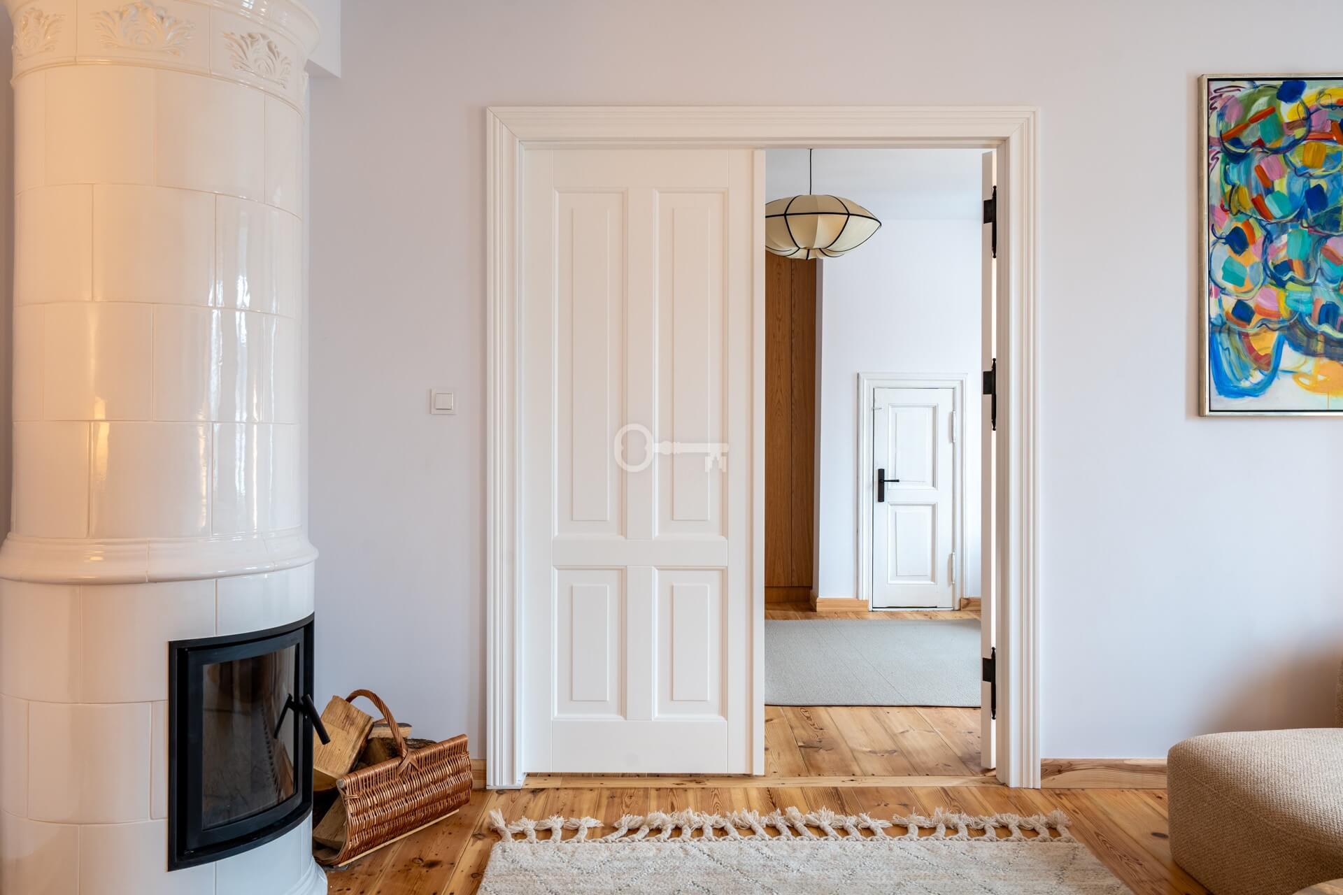 The living room features a magnificent and functioning Swedish tiled stove – handmade tiles, Kaflarnia Grochowski, Poland. The stove is made exclusively of natural materials.