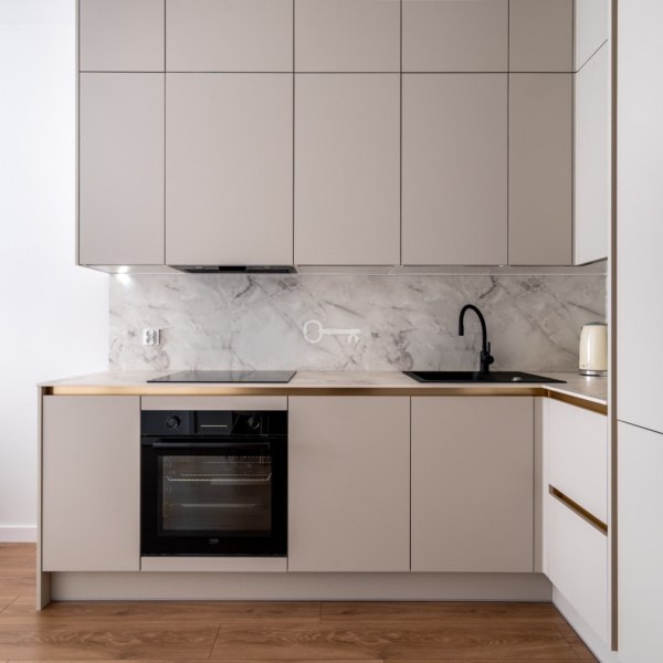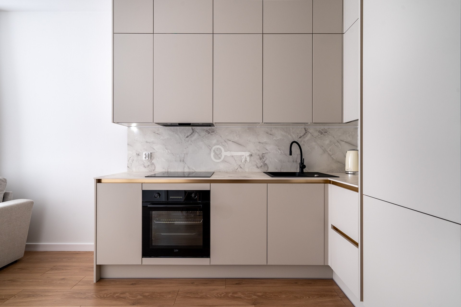 A modern kitchen in light colors, equipped with high-quality household appliances (fridge, induction hob, oven, dishwasher).