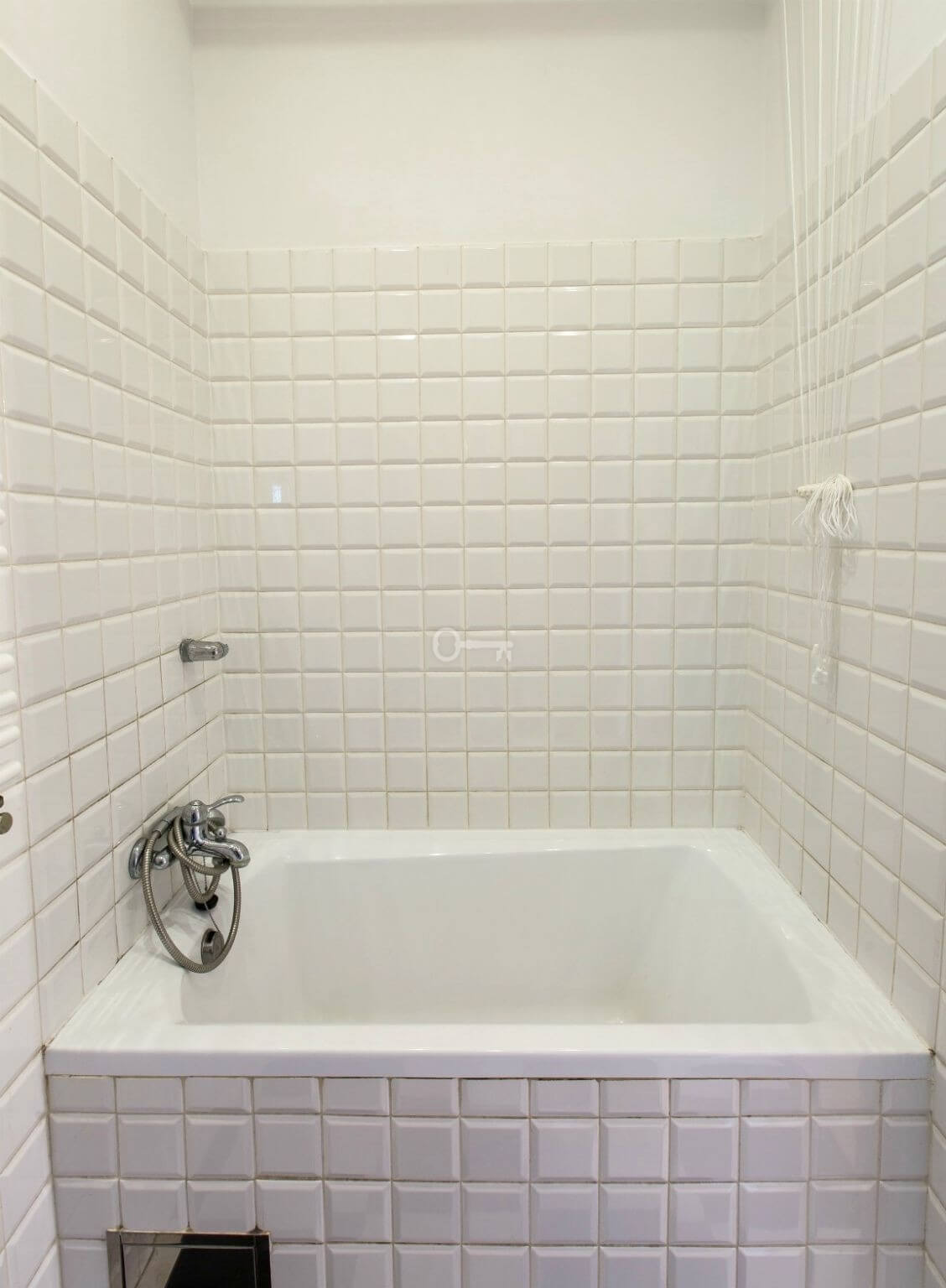 * a bathroom with a bathtub, a separate toilet, and a hallway with an industrial-style wardrobe,