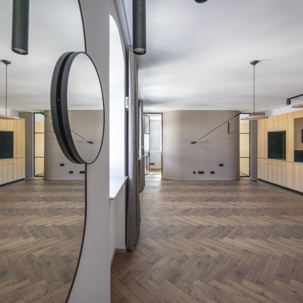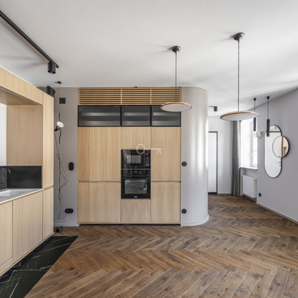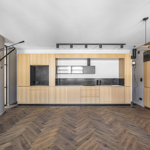 The flat is finished to the highest standard by an architect. The interiors are bright, spacious, and modern, yet minimalist and cozy. High ceilings and large glazing add to the flat’s appeal. A fully equipped kitchen is an additional asset.