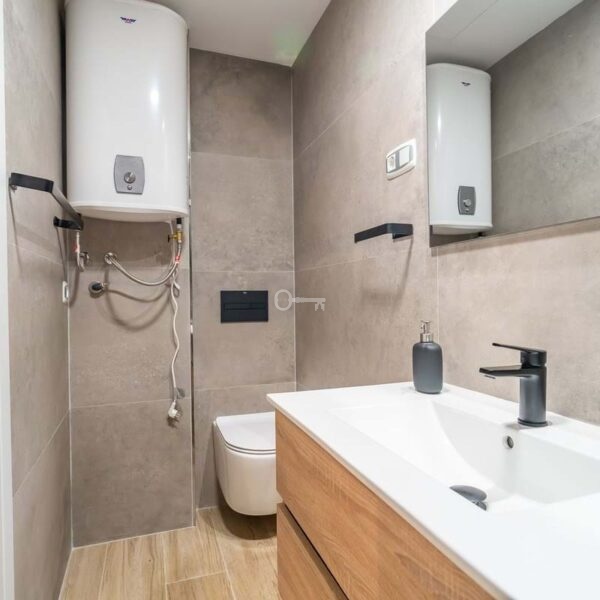 The property consists of an entrance hall, spacious living-dining room with fireplace, fully equipped kitchen and three bedrooms, each with its own en-suite bathroom. One of the bedrooms is located on the basement level and has independent access from the garage, providing additional privacy and comfort.