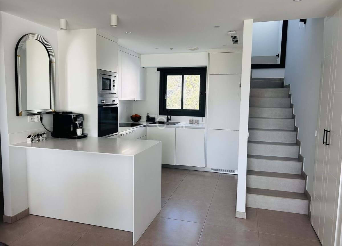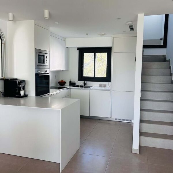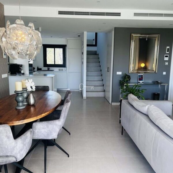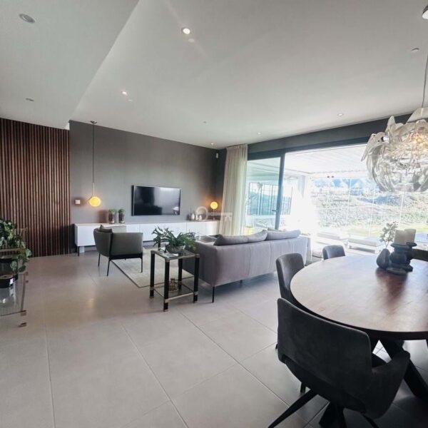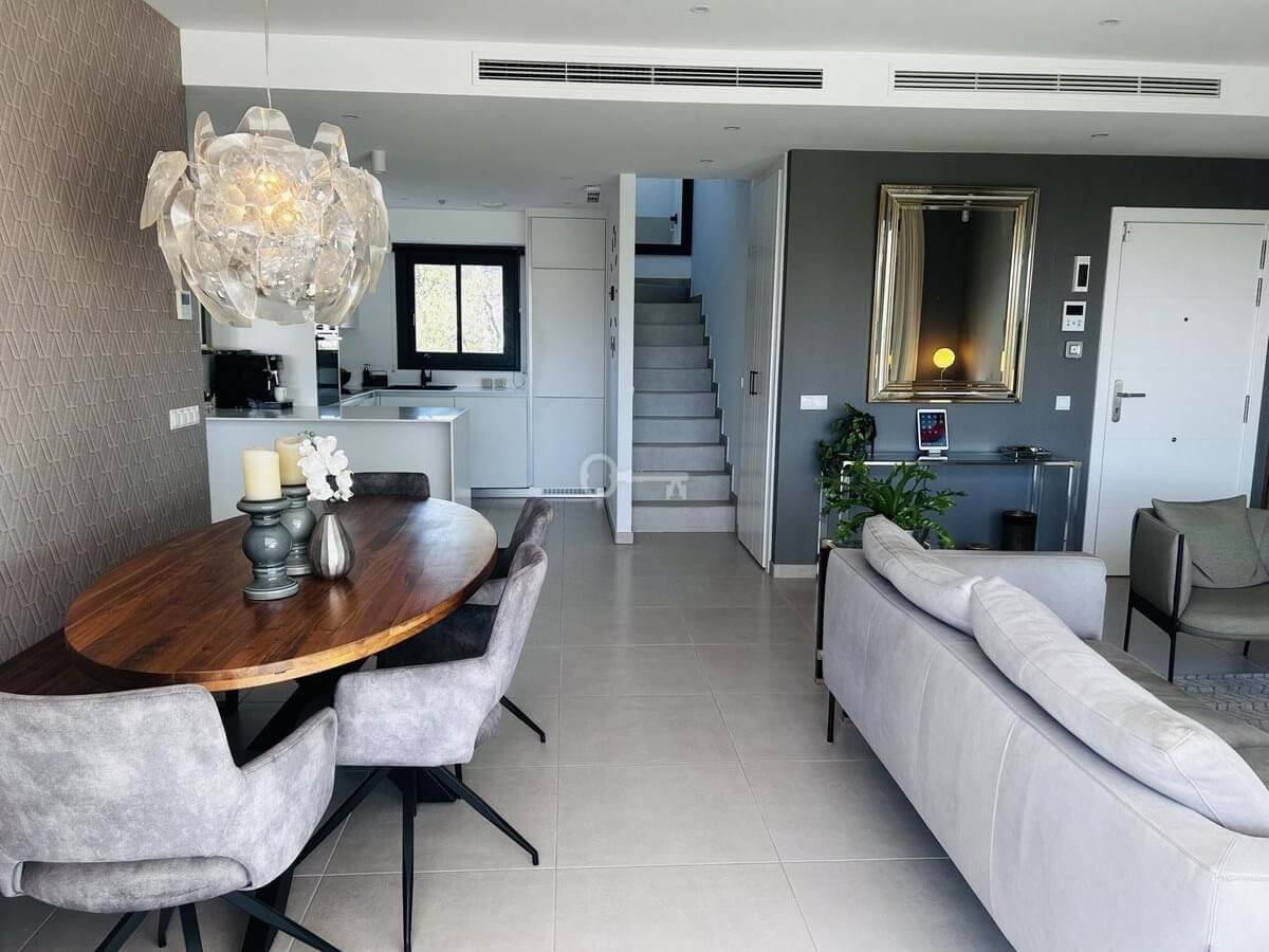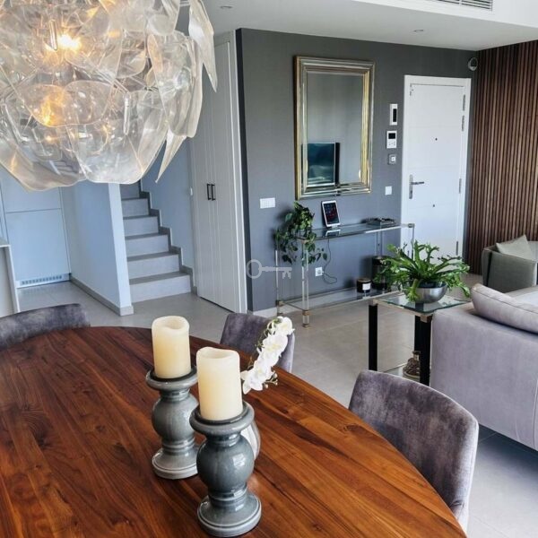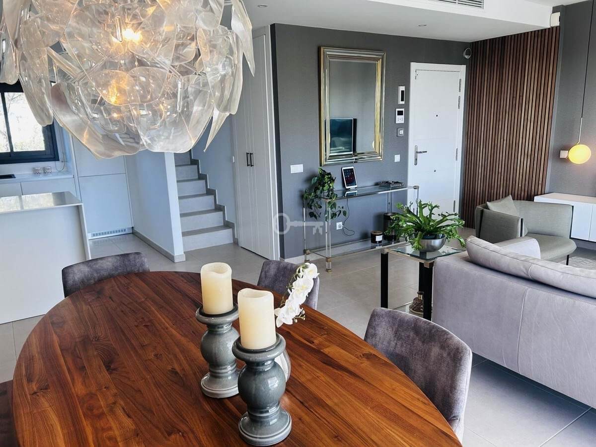 The penthouse is situated directly on the frontline of the famous Campo America golf course and offers breathtaking panoramic views of the mountains, golf courses and the Mediterranean Sea. It is distributed over 2 floors. On the main floor, the elegant living-dining area opens into a spacious terrace where sunrise become a masterpiece. The open-plan, fully equipped kitchen with Bosch electric appliances is designed for family meals and is complemented by practical utility cabinets. Two additional bedrooms offer comfort and privacy with a stunning view on the golf course and share the guest bathroom.