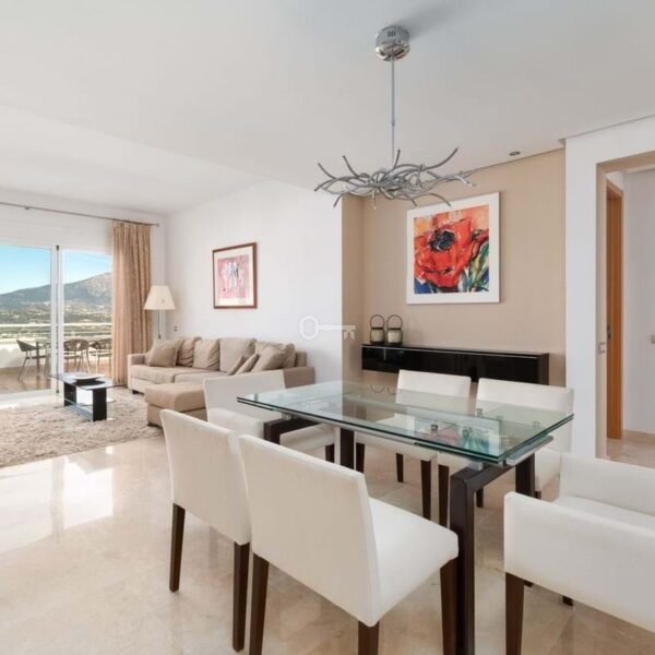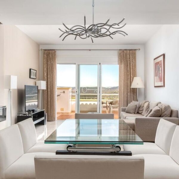 The expansive panoramic terrace offers uninterrupted views across the golf course, the Mediterranean Sea, and the Andalusian mountains a breathtaking backdrop that transforms beautifully at sunset.