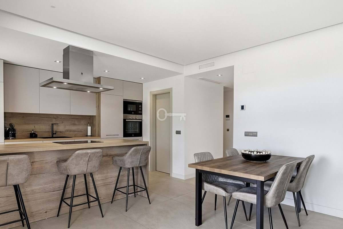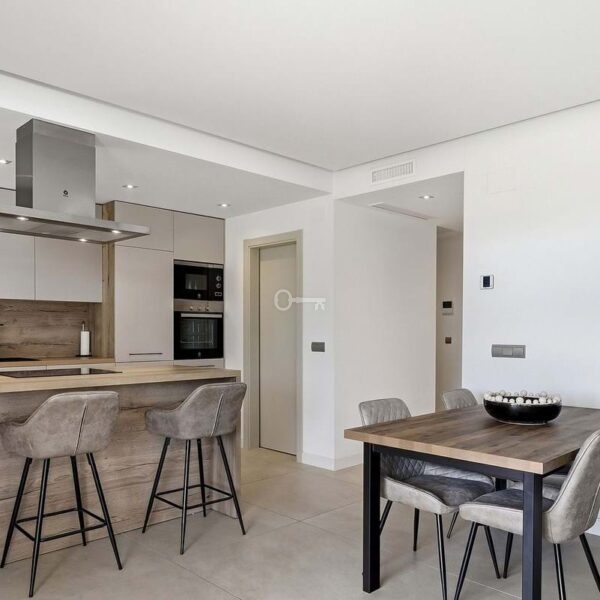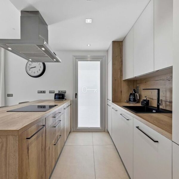 Inside, the open-plan living and dining area is flooded with natural light through floor to ceiling windows, seamlessly connecting to a sleek, fully fitted modern kitchen with a separate laundry room. The layout flows effortlessly onto the terrace, embracing a true indoor-outdoor lifestyle.