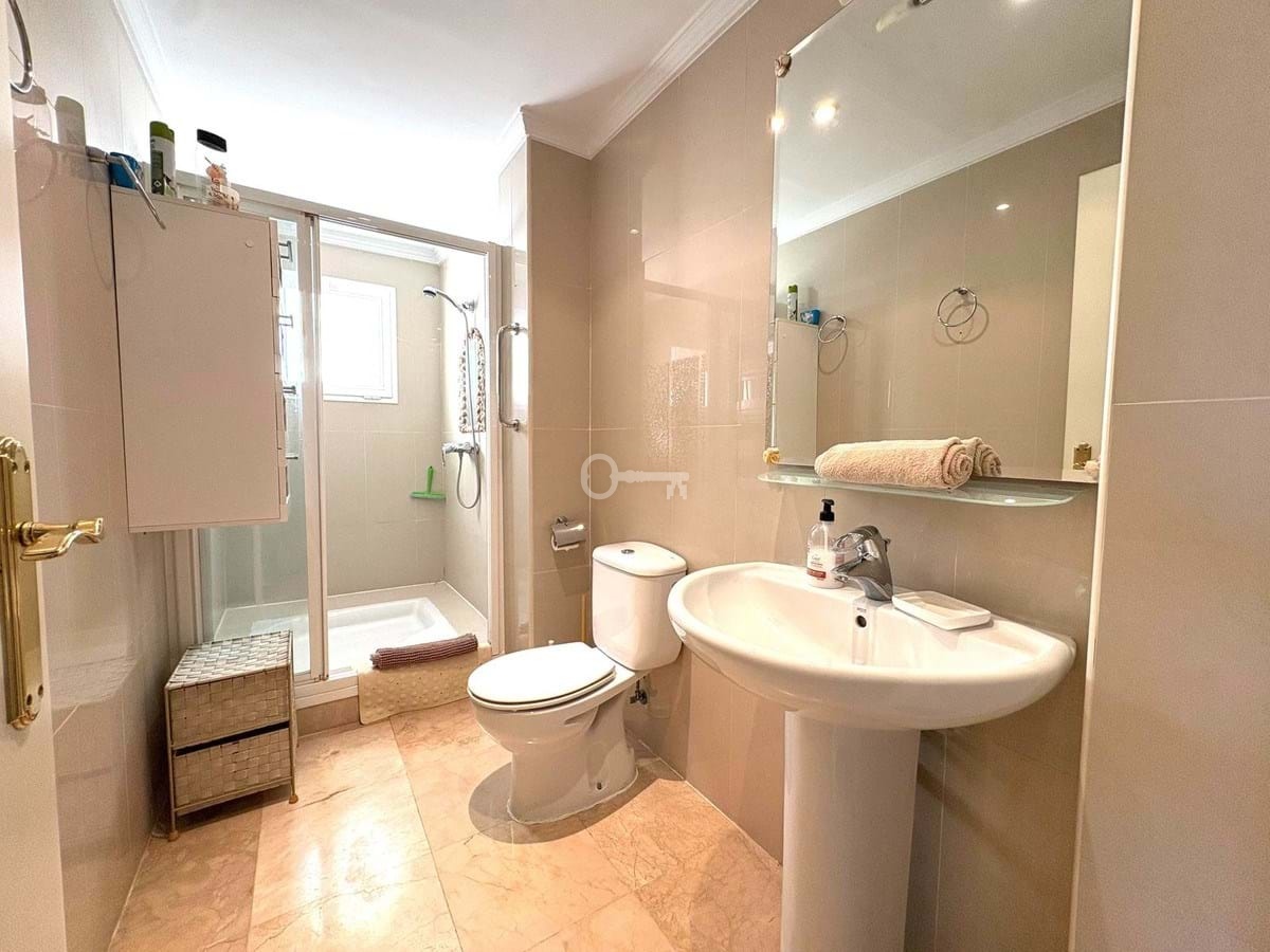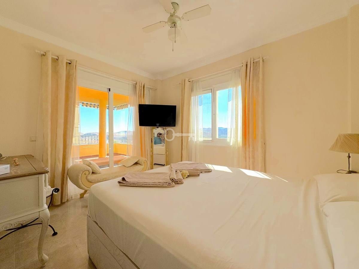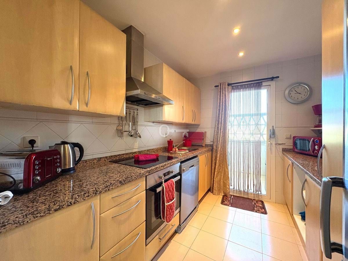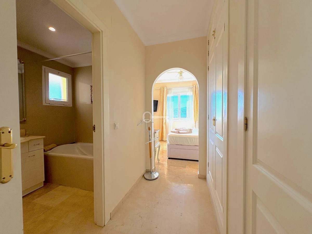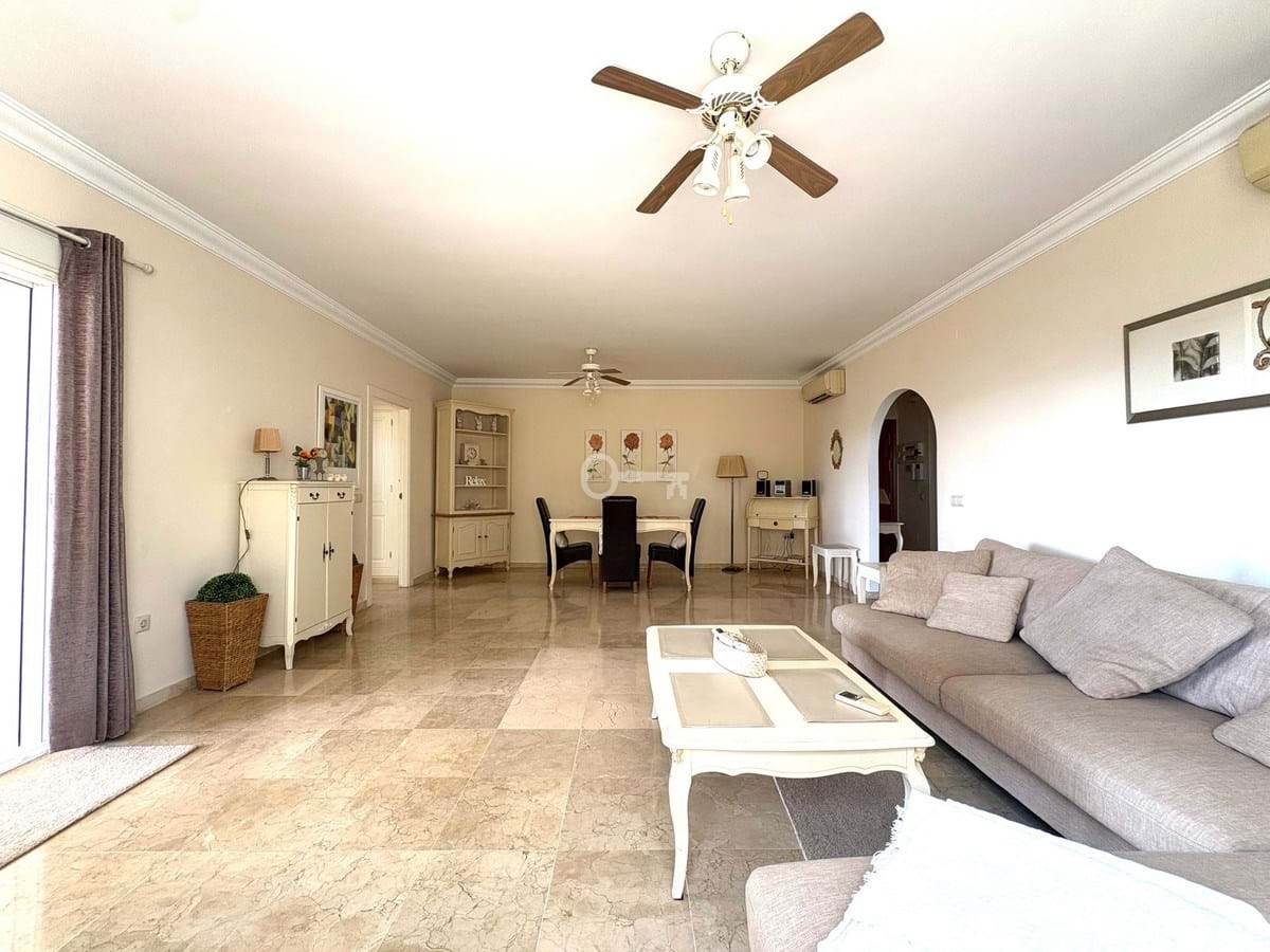 Expansive and tastefully decorated, this three-bedroom, two-bathroom apartment spans 116 m2 and features a spacious 42m2 lounge. The larger of the two terraces, measuring 33m2, faces West, providing breathtaking panoramic views of the picturesque landscape stretching towards Santana Golf. Meanwhile, the smaller terrace overlooks the pristine main pool and meticulously landscaped garden. Each room is equipped with individual air conditioning units for personalized comfort. The interior boasts high gloss marble floors throughout, and the kitchen is fully fitted with modern appliances. Additional amenities include underground parking, storage, a safe, video-entrance, and more. The apartment is offered unfurnished, with room for negotiation.