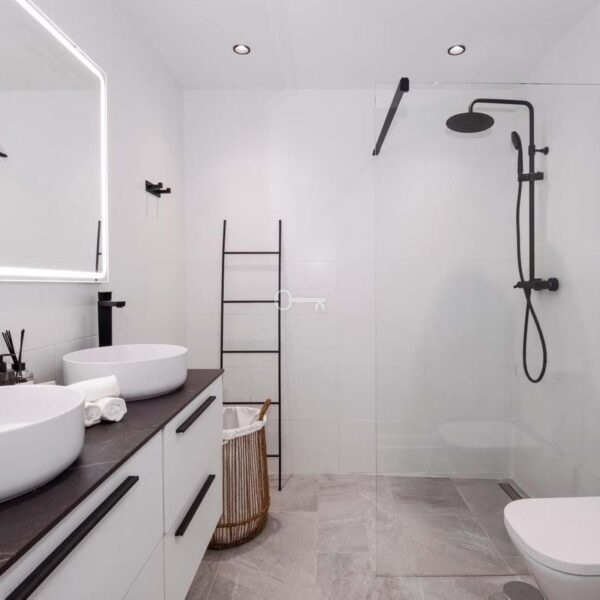 The apartment comprises two elegant bedrooms, with the principal bedroom benefiting from an en-suite bathroom and direct access to the terrace. The bathrooms are finished in a modern, minimalist style, featuring walk-in showers, rainfall fittings, contemporary sanitaryware, and subtle ambient lighting. A separate utility and laundry area further enhances the practicality of the home.