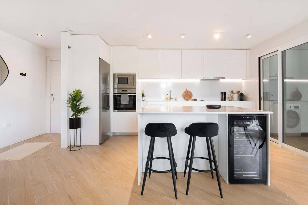 The interior features a generous open-plan layout, where the living and dining areas blend seamlessly with a stylish, fully fitted kitchen. Designed with both aesthetics and functionality in mind, the kitchen includes premium appliances, sleek cabinetry, and a central island that serves as a focal point for social living. Expansive sliding glass doors connect the living space to a spacious private terrace, creating an effortless indooroutdoor flow and offering open views over the surroundings and distant mountains.