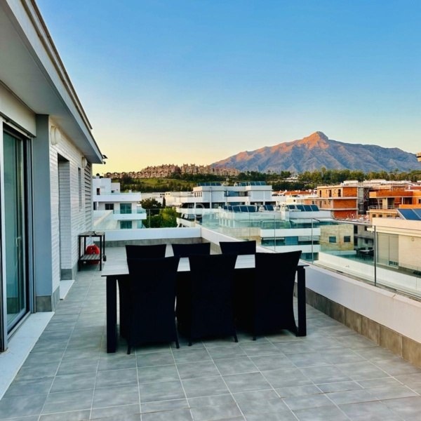 Fabulous dream penthouse with panoramic sea and mountain views in Jardines de Guadaiza, a development located in Nueva Andalucía. The complex enjoys a privileged location a short distance from all services, shops, restaurants, bars, offers a tennis-paddle court, several saltwater pools, a fully equipped community hall and a magnificent gym overlooking the pool and the incredible communal gardens. This property consists of: entrance hall; spacious and bright living/dining room with access to a large corner terrace with panoramic sea and mountain views; fully furnished and equipped open-plan kitchen with laundry room; master bedroom with a bathroom and access to the terrace; two other bedrooms sharing another bathroom. It comes with a parking space and a storage room in the underground community garage. Due to its corner position and the views offered by the property, this is undoubtedly the best penthouse in the complex.