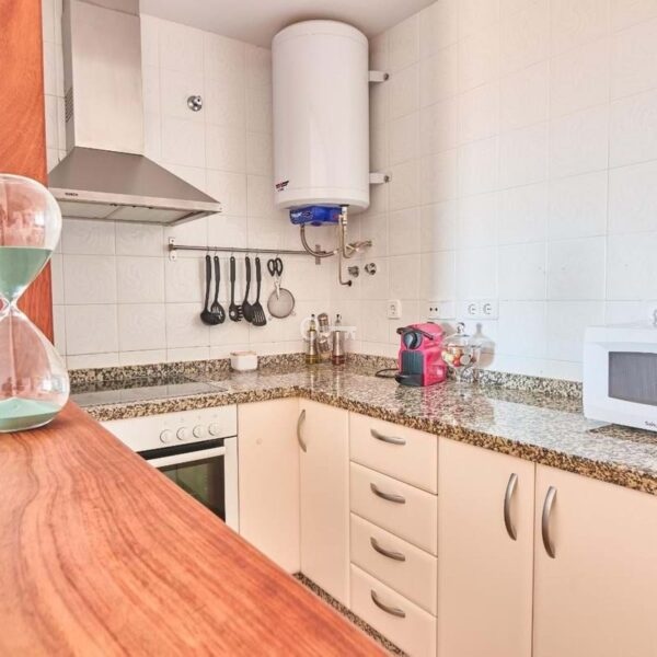 This two bedroom apartment offers direct sea views from its private south facing terrace, a cosy living and dining area with open plan fully fitted kitchen, two generously sized bedrooms with fully fitted wardrobes, two bathrooms, one of which is en-suite. Hot and cold air-conditioning throughout and underground parking is also included.