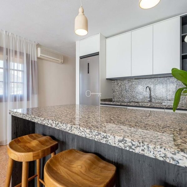 From the large windows, you can enjoy open views of the sea and the beach, creating a constant sense of calm and connection to the Mediterranean. The open-plan living area is both functional and welcoming, designed for relaxed everyday living.