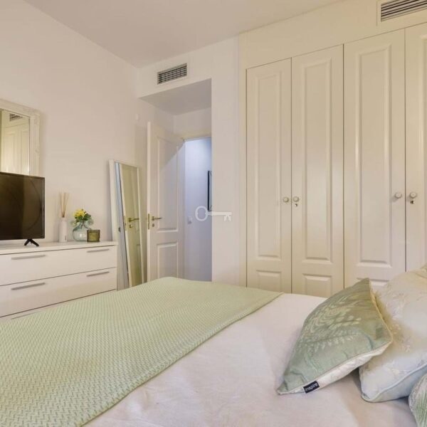 There are three generous double bedrooms, all with terrace access. The private master suite sits on its own side of the apartment and features a windowed ensuite bathroom, excellent storage, and direct terrace access. Bedrooms two and three are bright and welcoming, with the third enjoying its own charming balcony. A modern second bathroom with a walk-in shower serves the guest rooms.