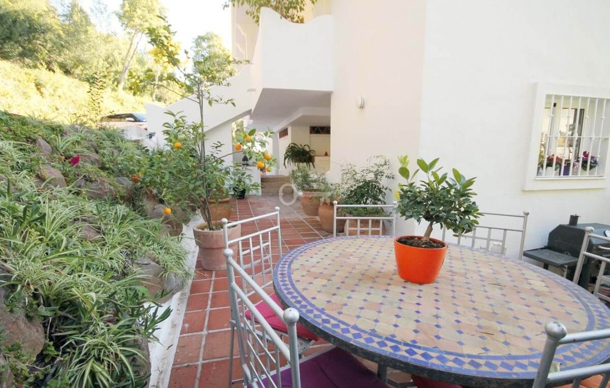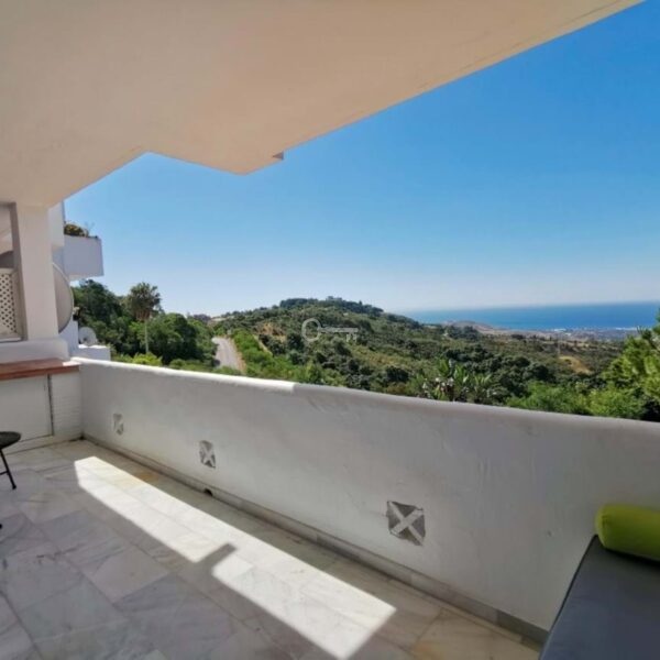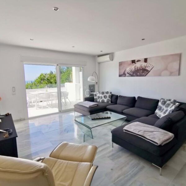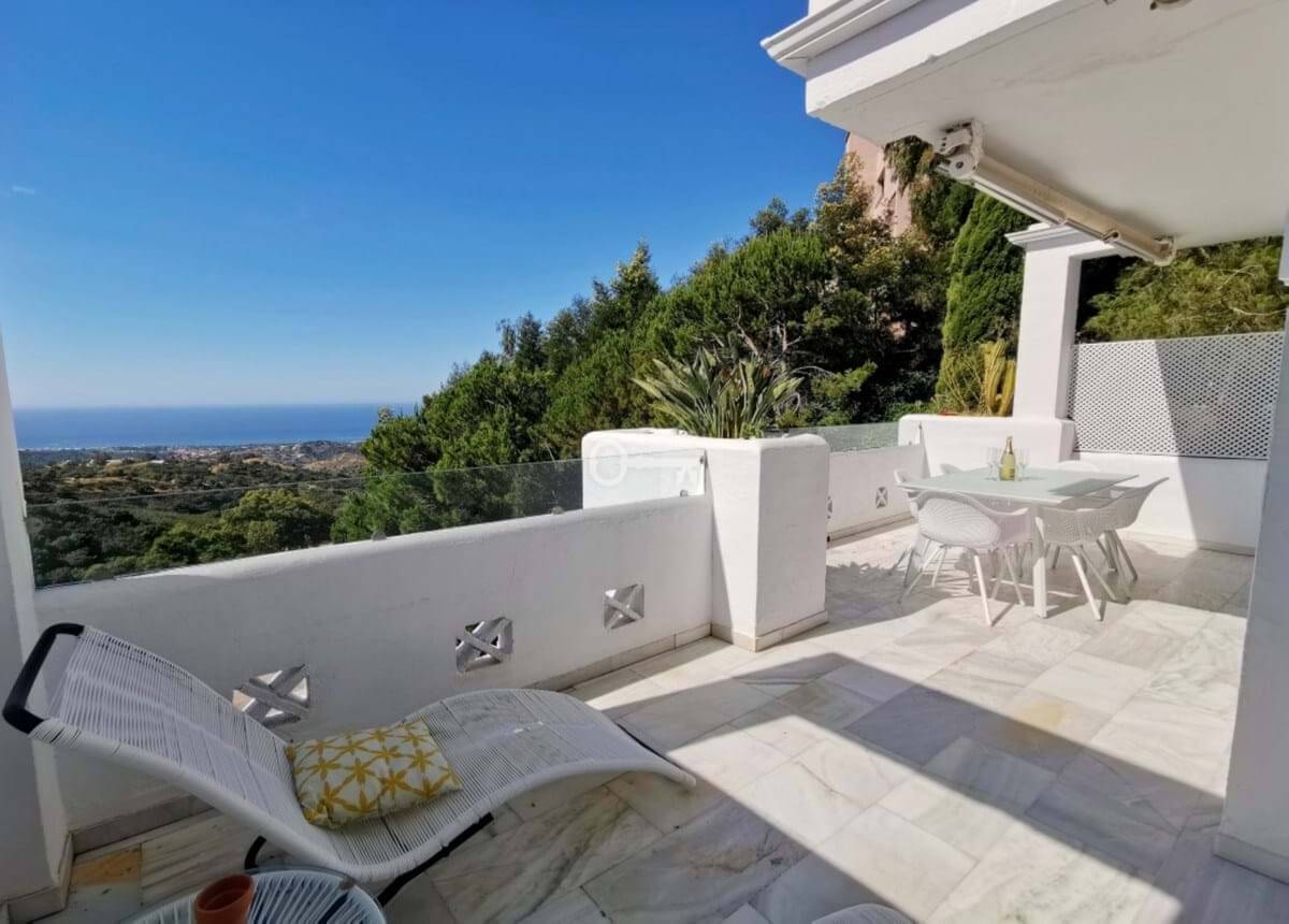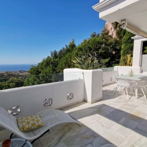 WHAT A VIEW! This superb south facing 3 bed corner duplex apartment lies on the hills of Elviria and boasts utterly breathtaking views to the sea towards the coasts of Africa. Probably the best unit in this small complex of 28 neighbors only, the apartment has been tastefully refurbished and upgraded, is in excellent condition and perrfectly equipped. The property features on a main floor a good size living-dining room open onto a superb terrace with commanding views, luxury open plan kitchen with Silestone work-top and Bosh appliances, one double bedroom with large wardrobes opening onto the main terrace and one bathroom with large walk-in shower. The lower level accommodates the 2nd and 3rd bedrooms both with large wardrobes sharing a large bathroom and a beautiful covered terrace with stunning views as well. This property is by far the most private within the complex and benefits from a large rear patio with al-fresco dining and BBQ area and a private storage room. The community is gated, very peaceful and private, perfectly integrated in the naturals surroundings with a superb swimming-pool and parking spaces. Ideal for long term stay or family holiday. It really worths a viewing.