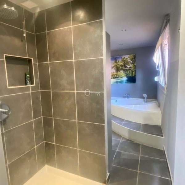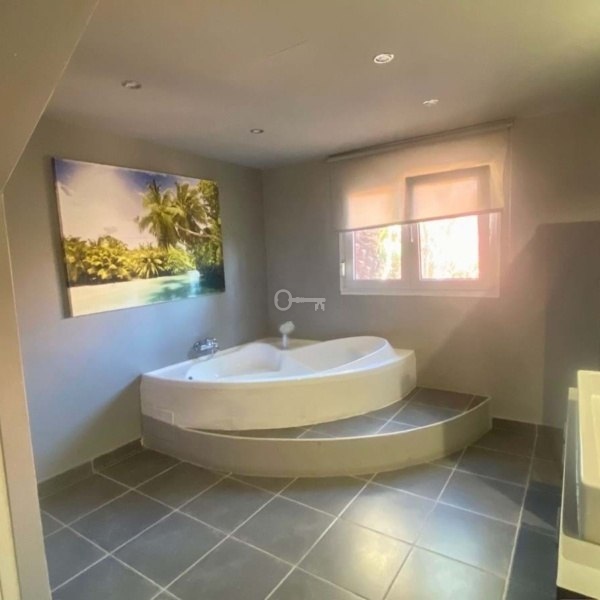 A dream bathroom: spacious and bright, featuring a corner bathtub perfect for relaxation and a separate shower for everyday convenience.