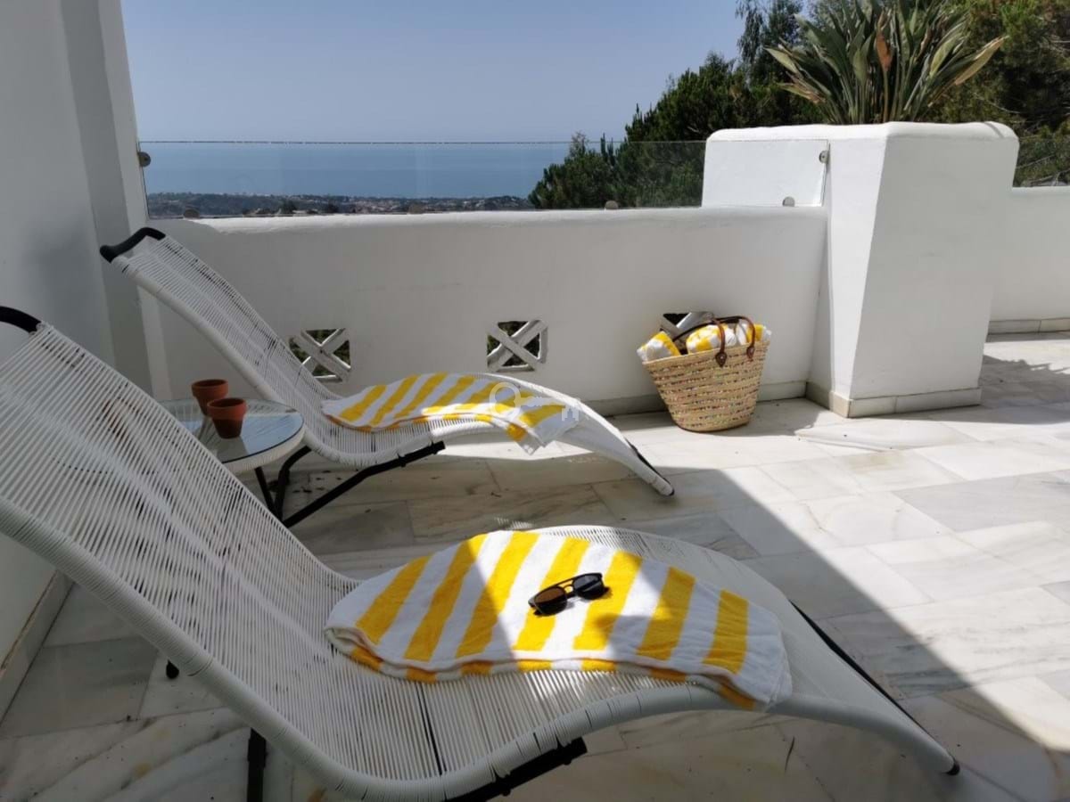 WHAT A VIEW! This superb south facing 3 bed corner duplex apartment lies on the hills of Elviria and boasts utterly breathtaking views to the sea towards the coasts of Africa. Probably the best unit in this small complex of 28 neighbors only, the apartment has been tastefully refurbished and upgraded, is in excellent condition and perrfectly equipped. The property features on a main floor a good size living-dining room open onto a superb terrace with commanding views, luxury open plan kitchen with Silestone work-top and Bosh appliances, one double bedroom with large wardrobes opening onto the main terrace and one bathroom with large walk-in shower. The lower level accommodates the 2nd and 3rd bedrooms both with large wardrobes sharing a large bathroom and a beautiful covered terrace with stunning views as well. This property is by far the most private within the complex and benefits from a large rear patio with al-fresco dining and BBQ area and a private storage room. The community is gated, very peaceful and private, perfectly integrated in the naturals surroundings with a superb swimming-pool and parking spaces. Ideal for long term stay or family holiday. It really worths a viewing.