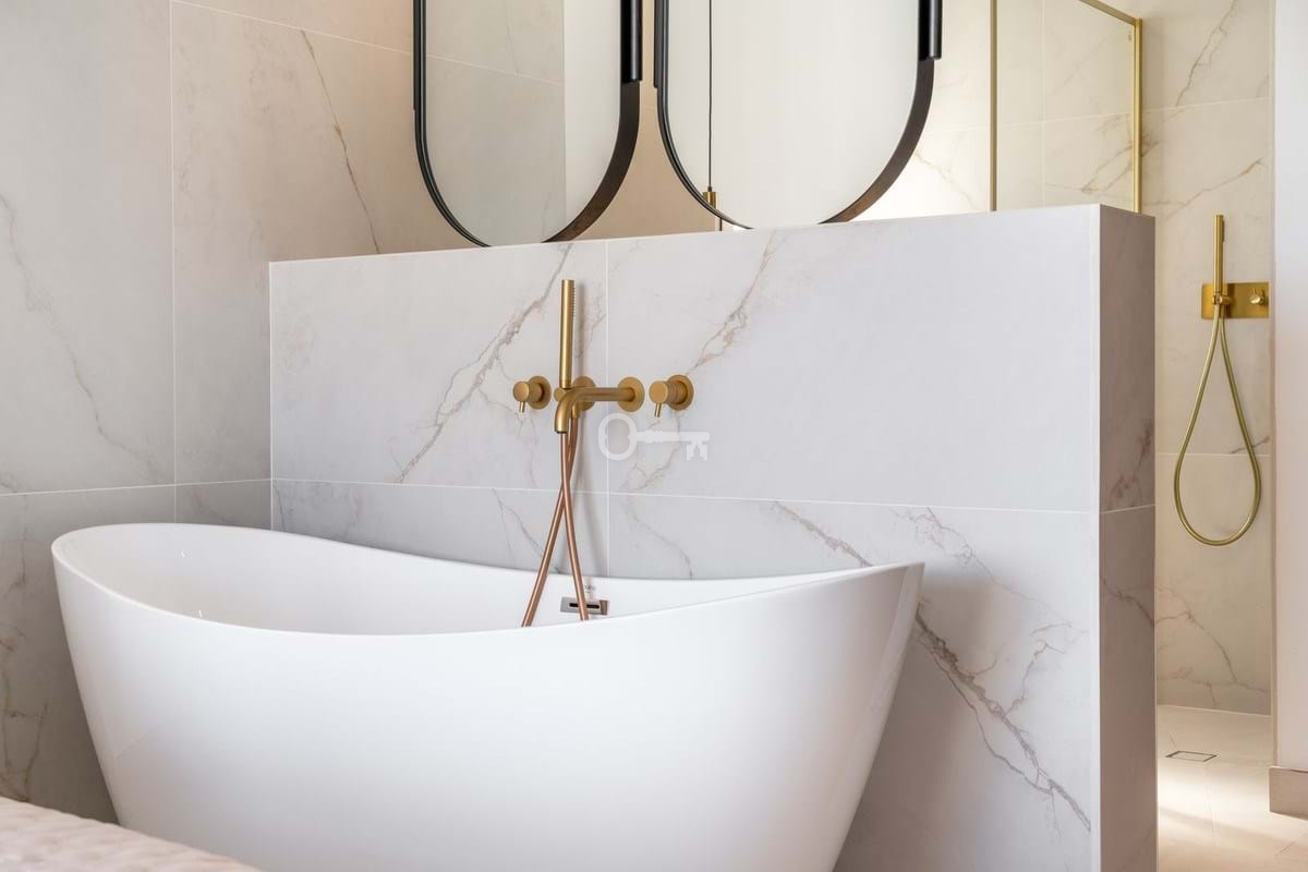 The master suite is conceived as a sanctuary, where a dramatic freestanding bath has been purposefully positioned to embrace sweeping views of both sea and landscape. Each bathroom is completed with luxurious Italian tiling, underscoring the propertys refined aesthetic.