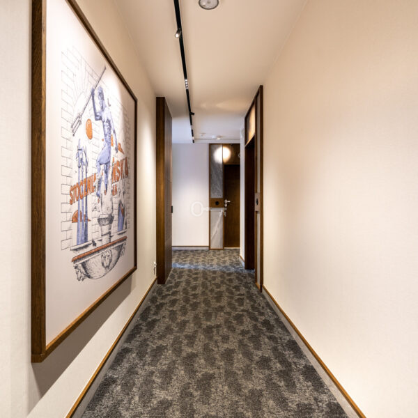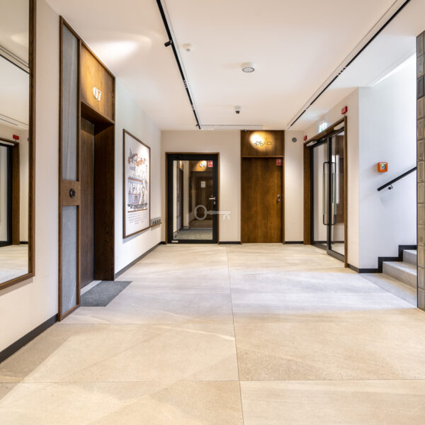 The hall of the building is finished with elegant wallpaper and lined with carpeting, which provides comfortable silence.
